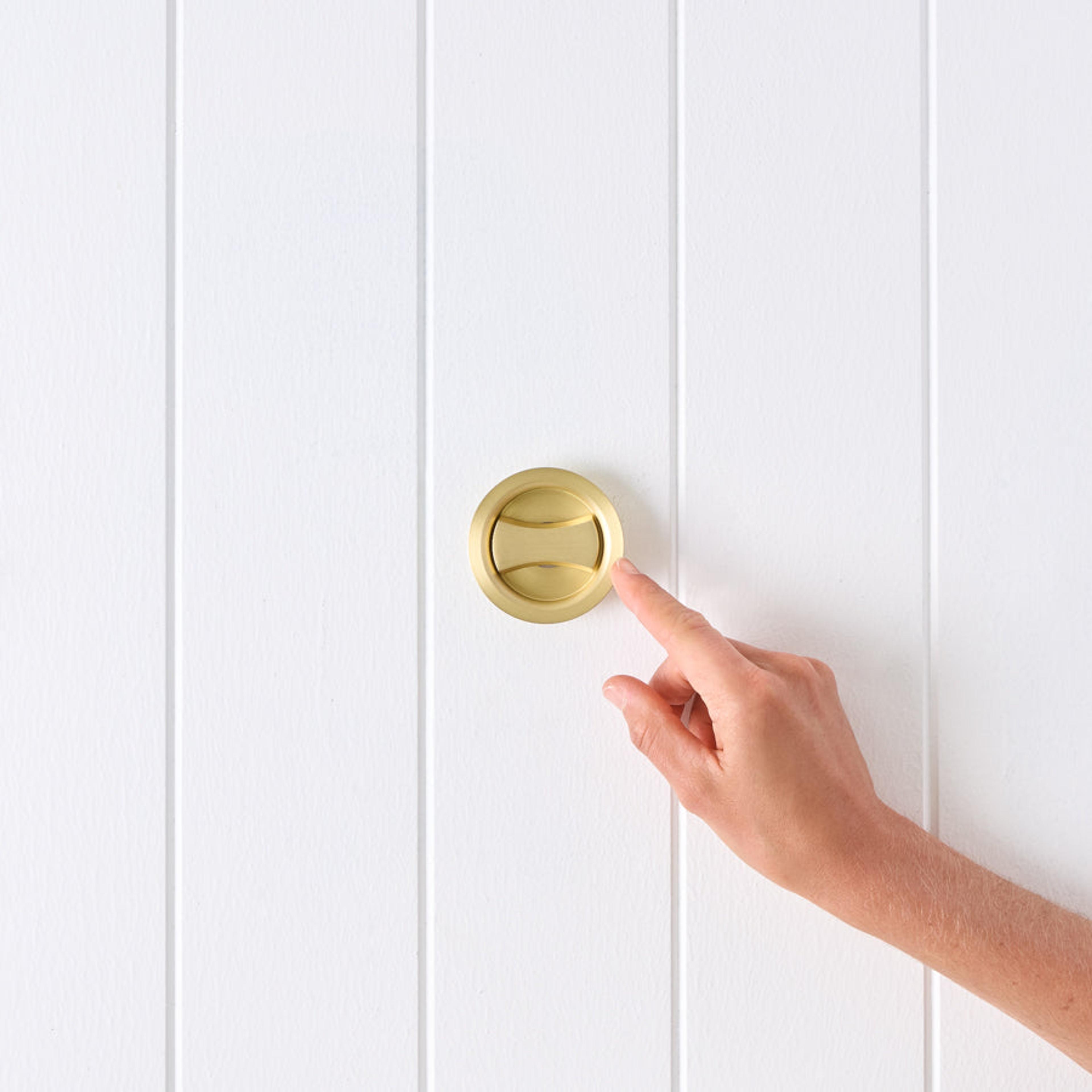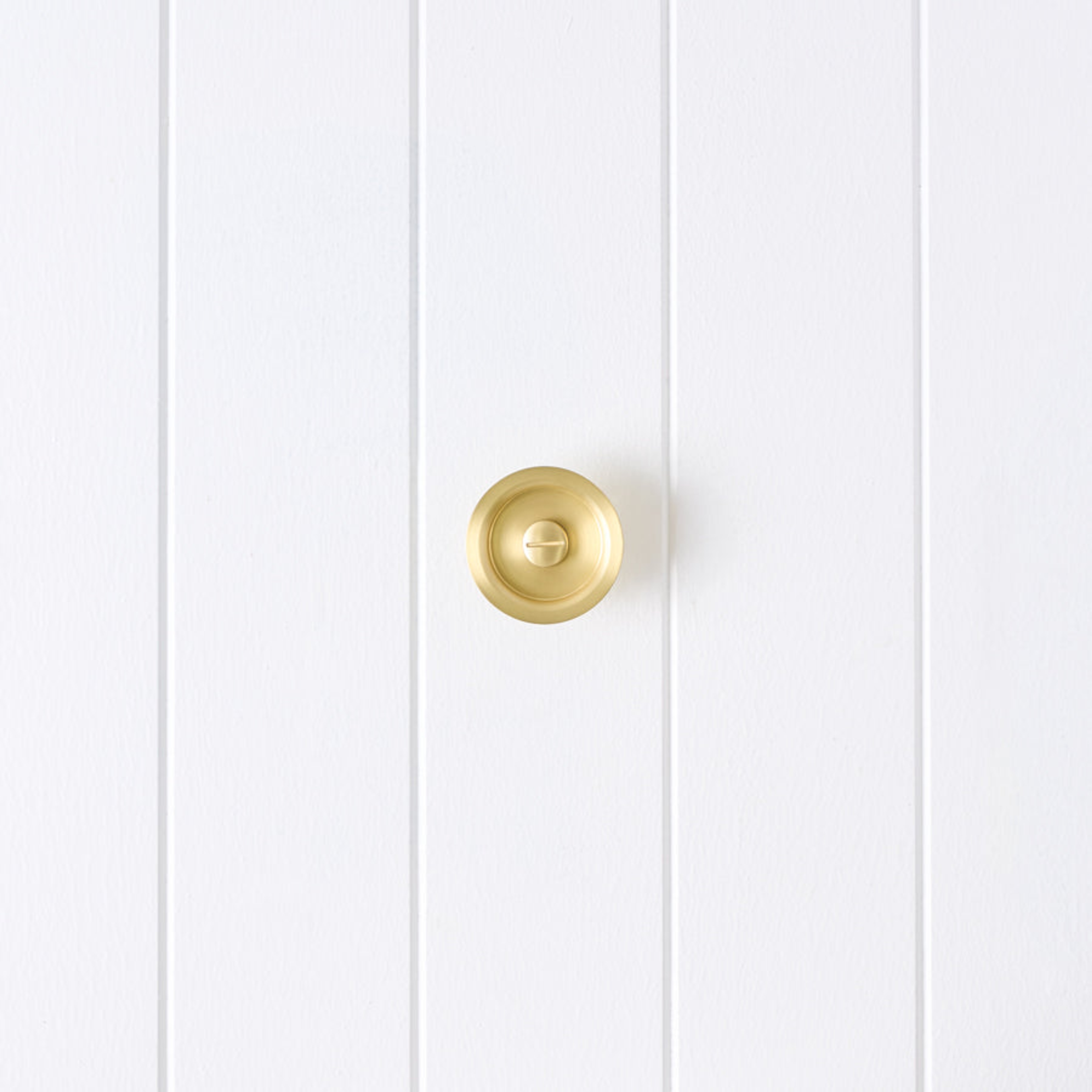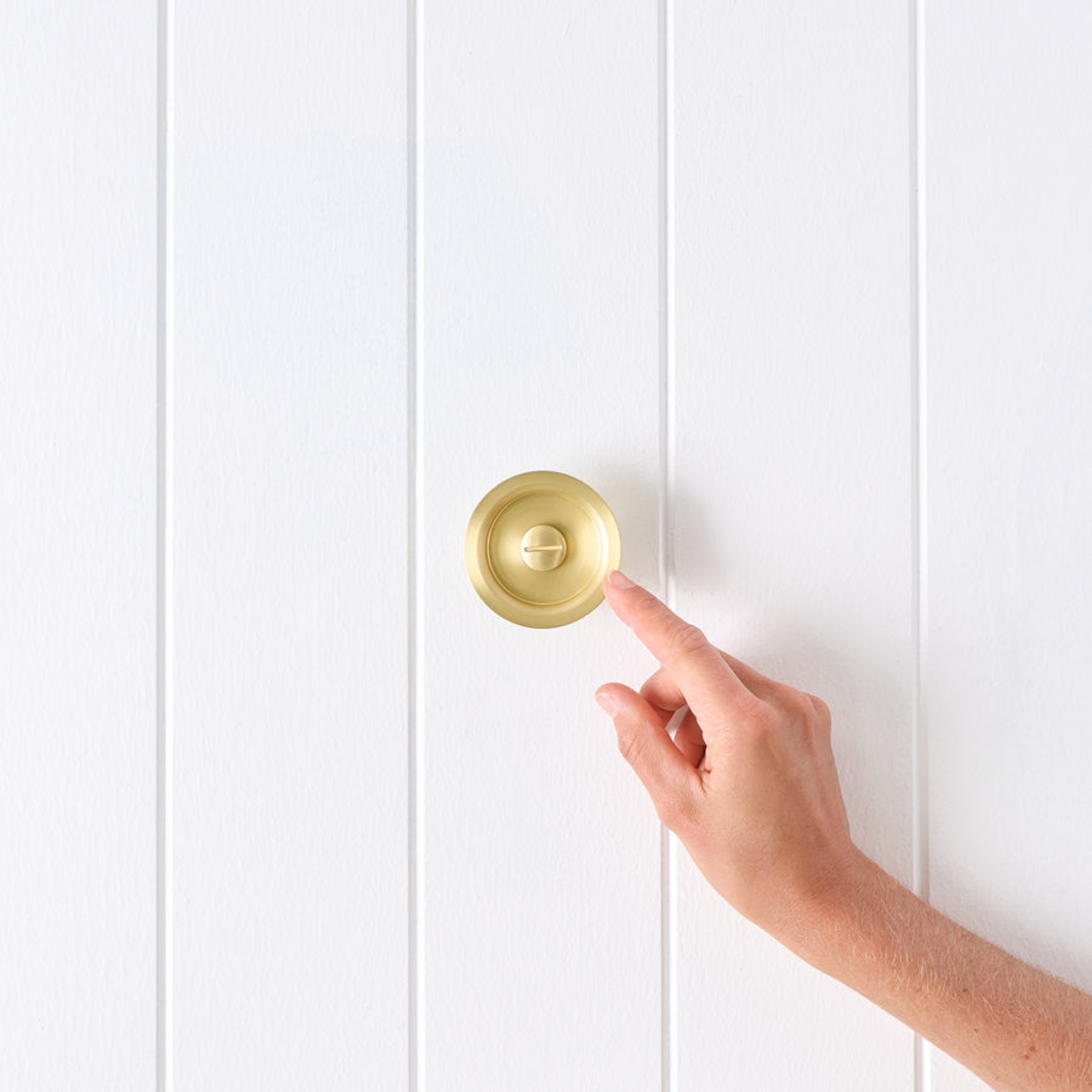 The Sliding Door Lock in Brushed Brass is ideal for bathrooms and bedrooms that need simple privacy. The stainless steel mechanism is reliable, the turn is comfortable to grip, and the brushed finish hides fingerprints. A small coin can operate the emergency release from the hall, giving added safety for kids and guests.