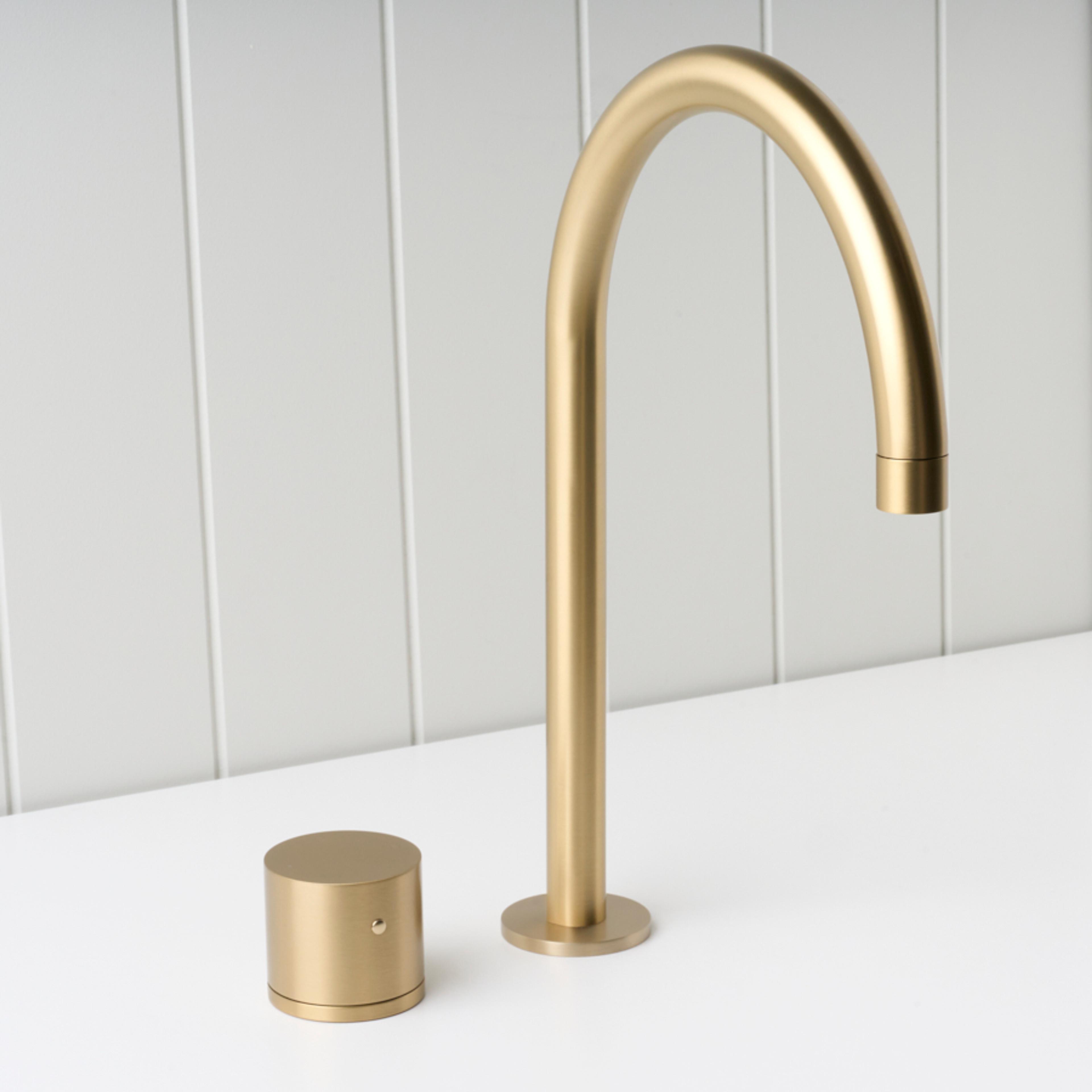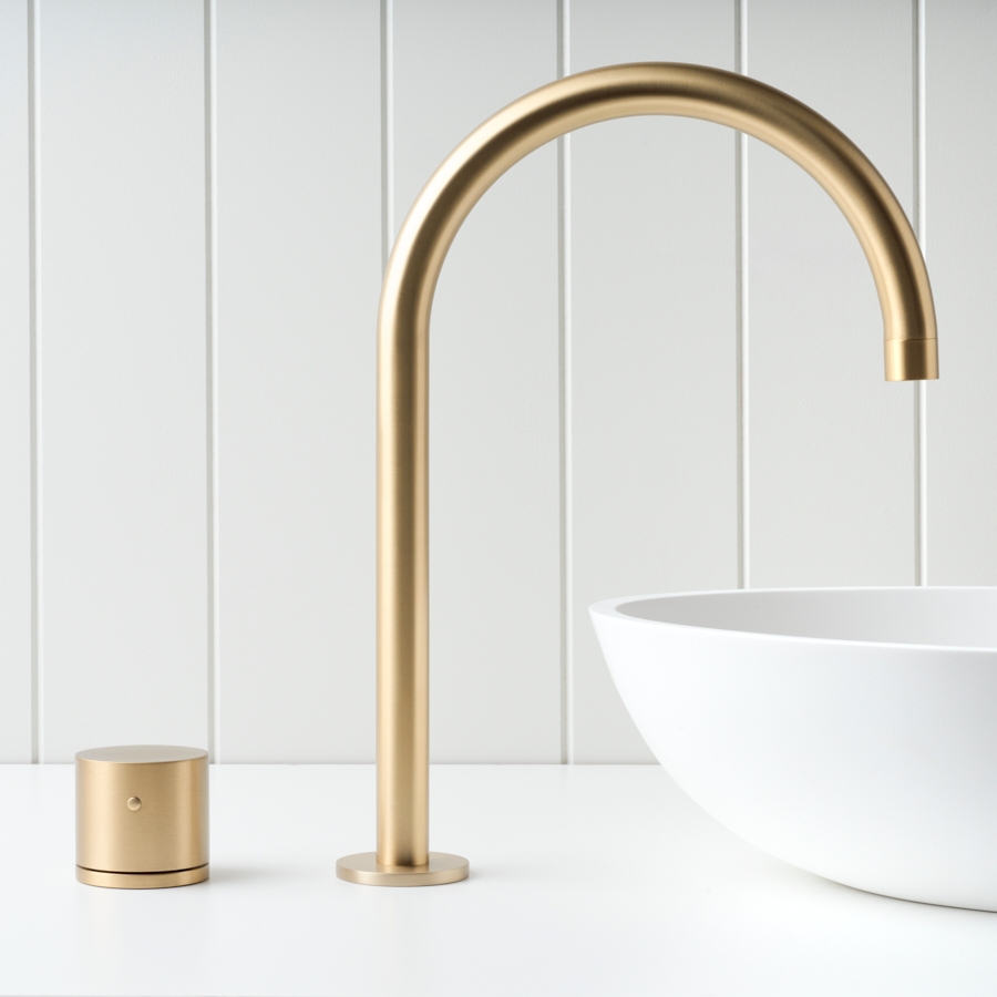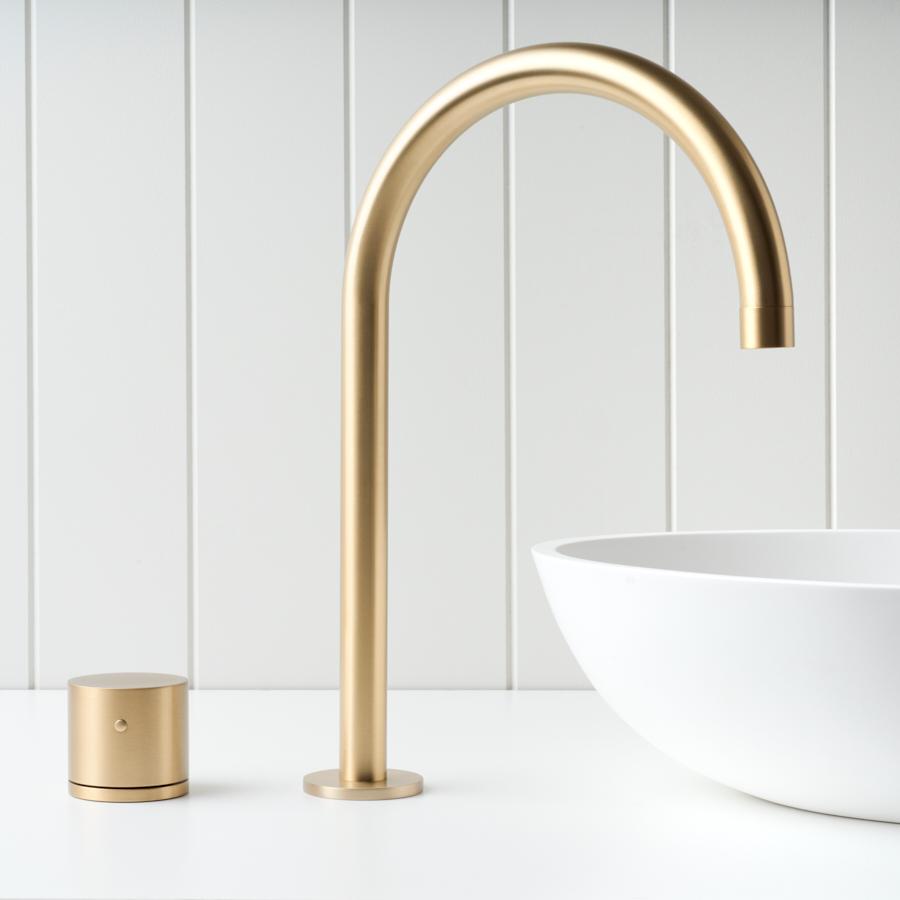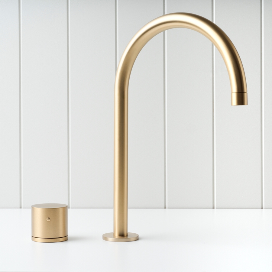 Sydney Basin Spout + Benchtop Progressive Mixer Brushed Brass