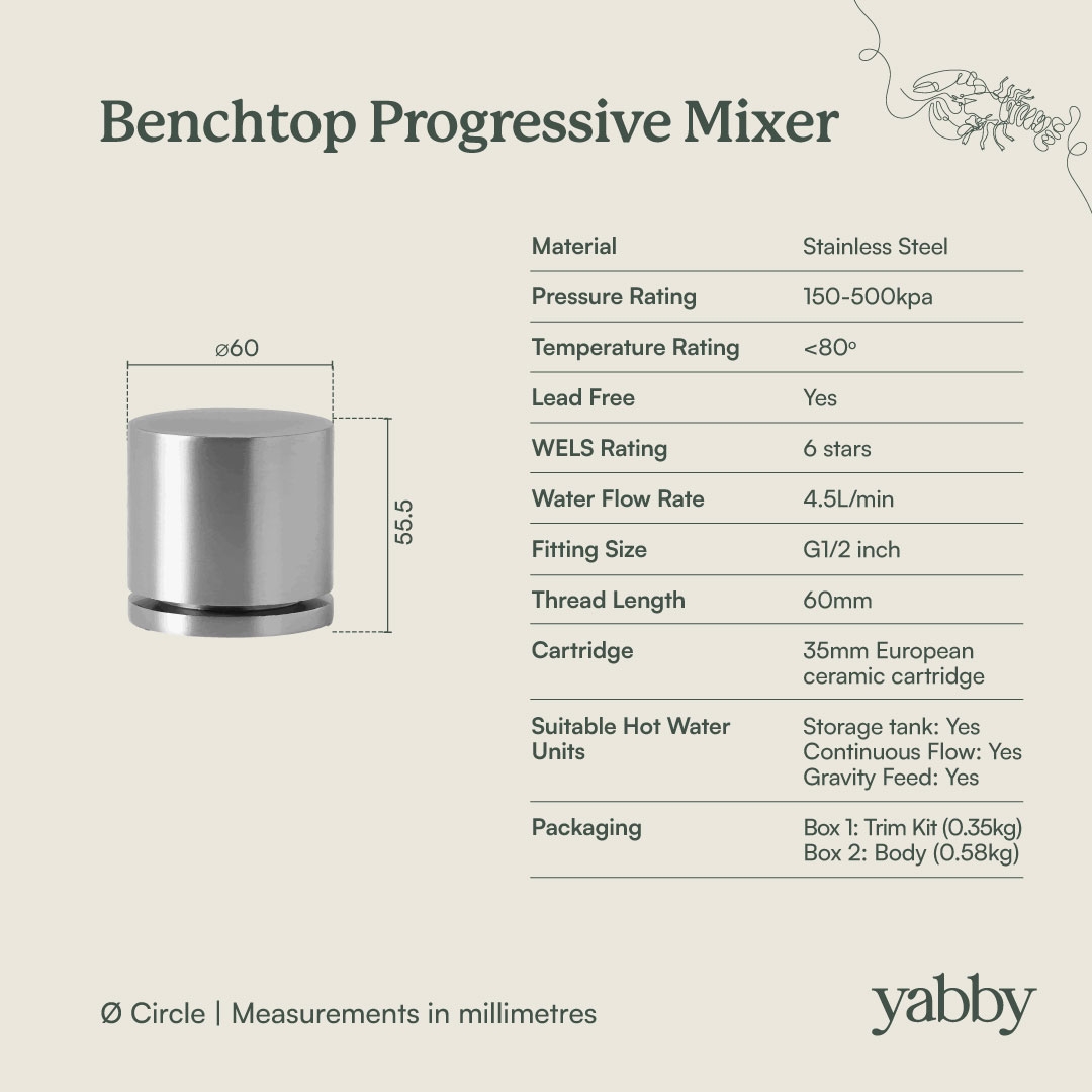 The Sydney Basin Spout and Benchtop Progressive Mixer in Stainless Steel is a smart, low fuss choice for family bathrooms. The durable stainless steel finish hides wear, and the progressive mixer lets you dial up both pressure and warmth in one steady turn. Easy to wipe clean and straightforward for everyone to operate.