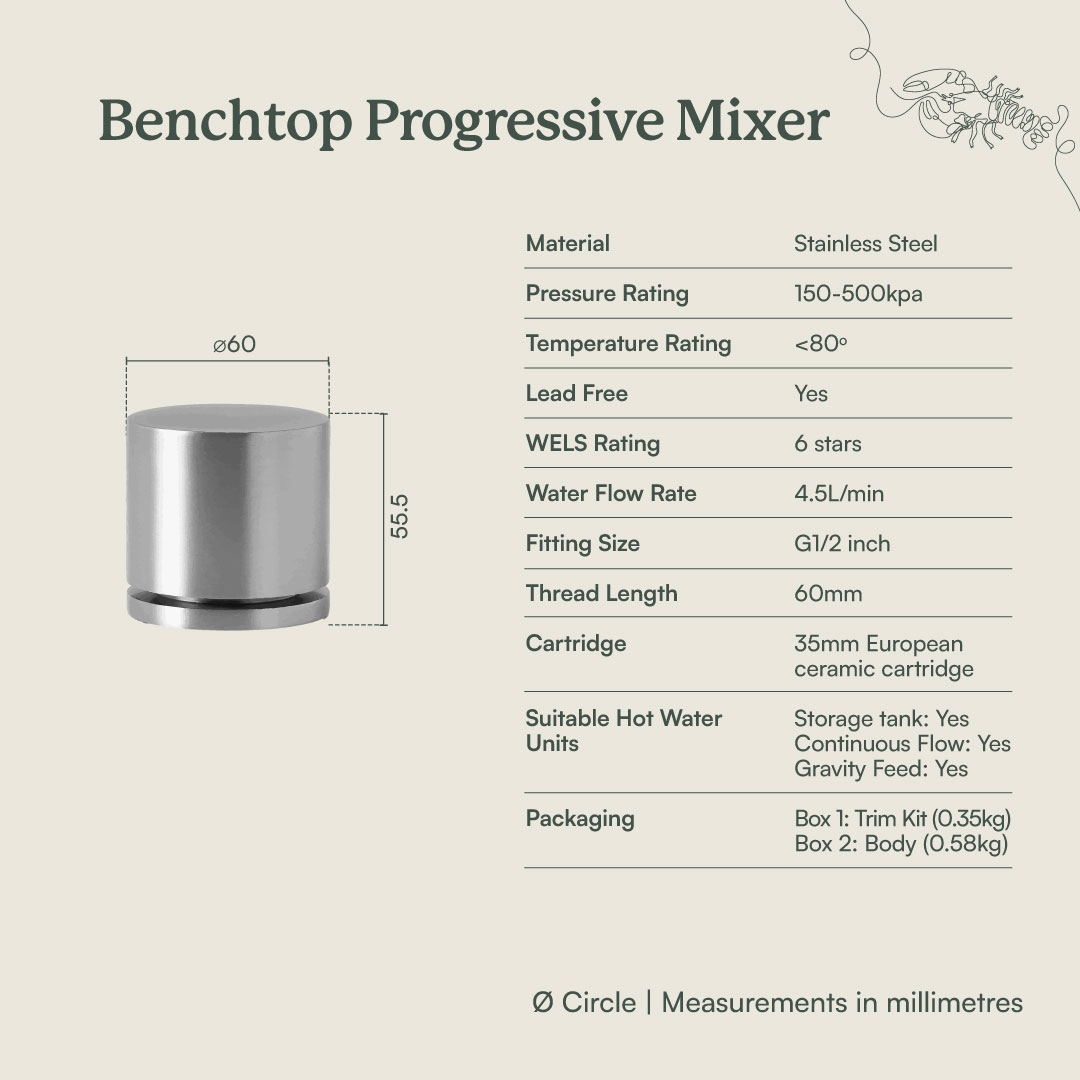 The Sydney Basin Spout and Benchtop Progressive Mixer in Warm Brushed Nickel suits homes that mix different metal finishes. The stainless steel construction is tough, and the progressive mixer makes it easy to set just the right pressure and warmth with one hand. A practical, user friendly option for everyday family use.