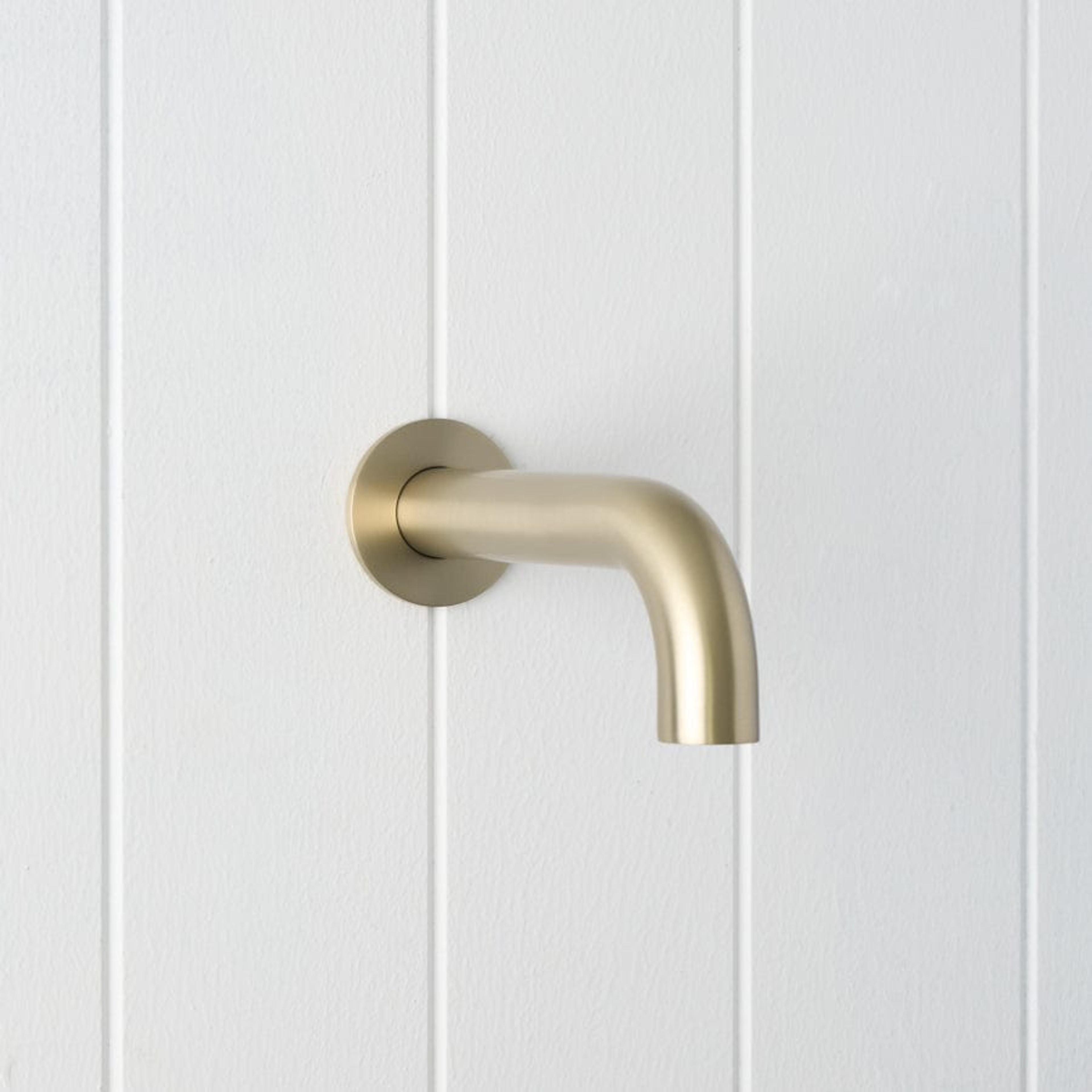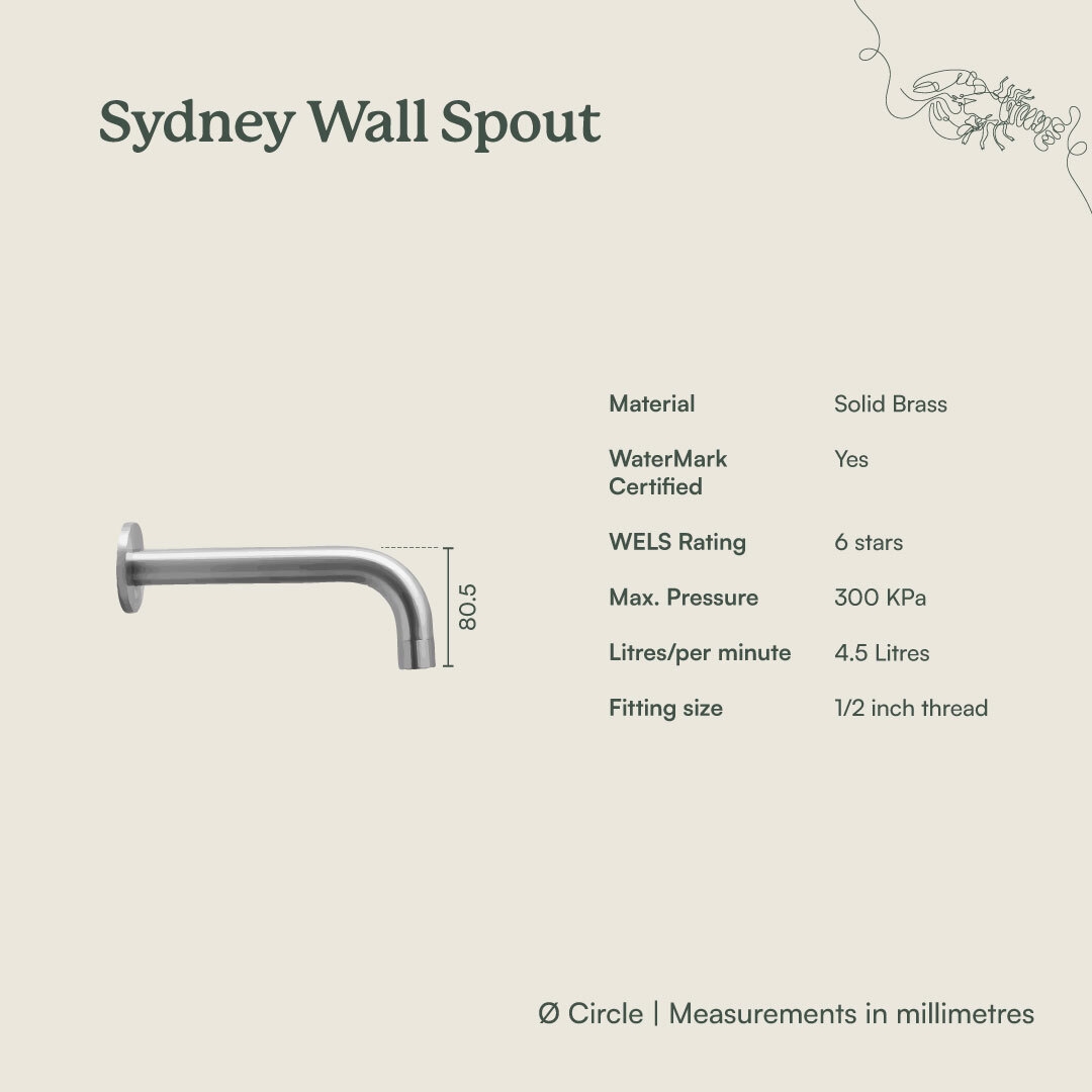 The Sydney Wall Spout in Warm Brushed Nickel brings a soft, neutral tone to the basin or bath. The Warm Brushed Nickel finish over stainless steel sits comfortably with both warm and cool palettes, while the gentle curve keeps the wall feeling calm. It is a quiet but considered detail.