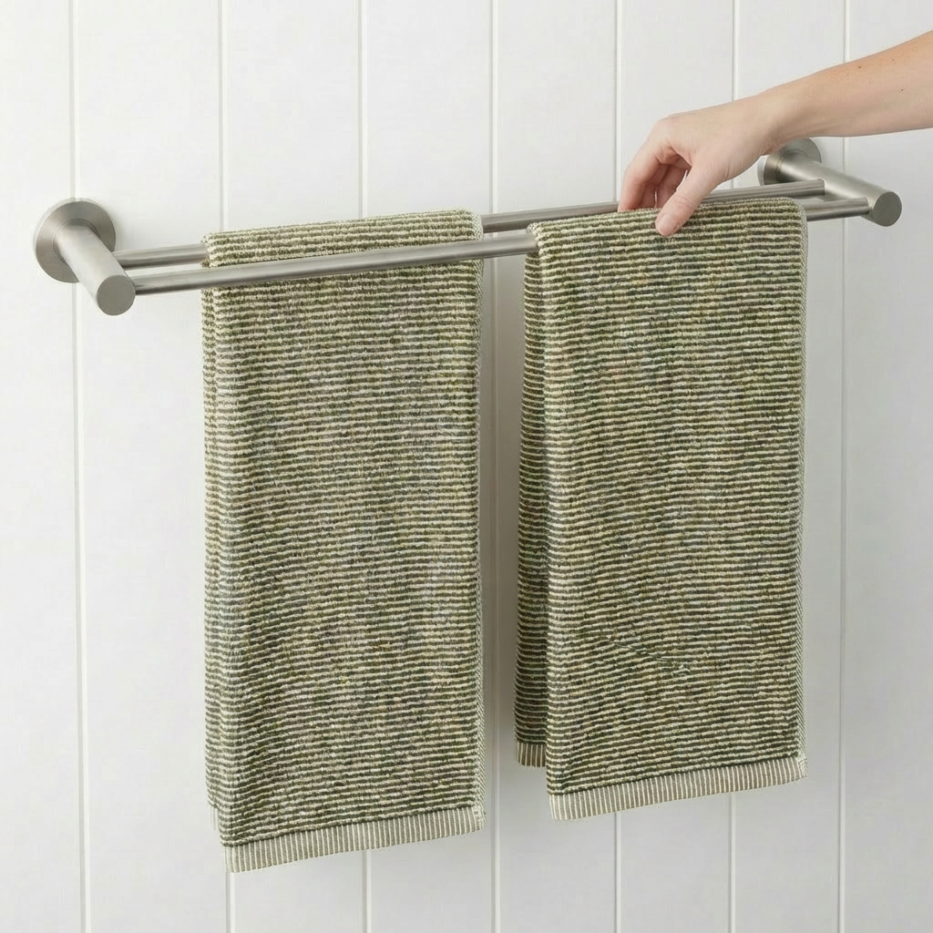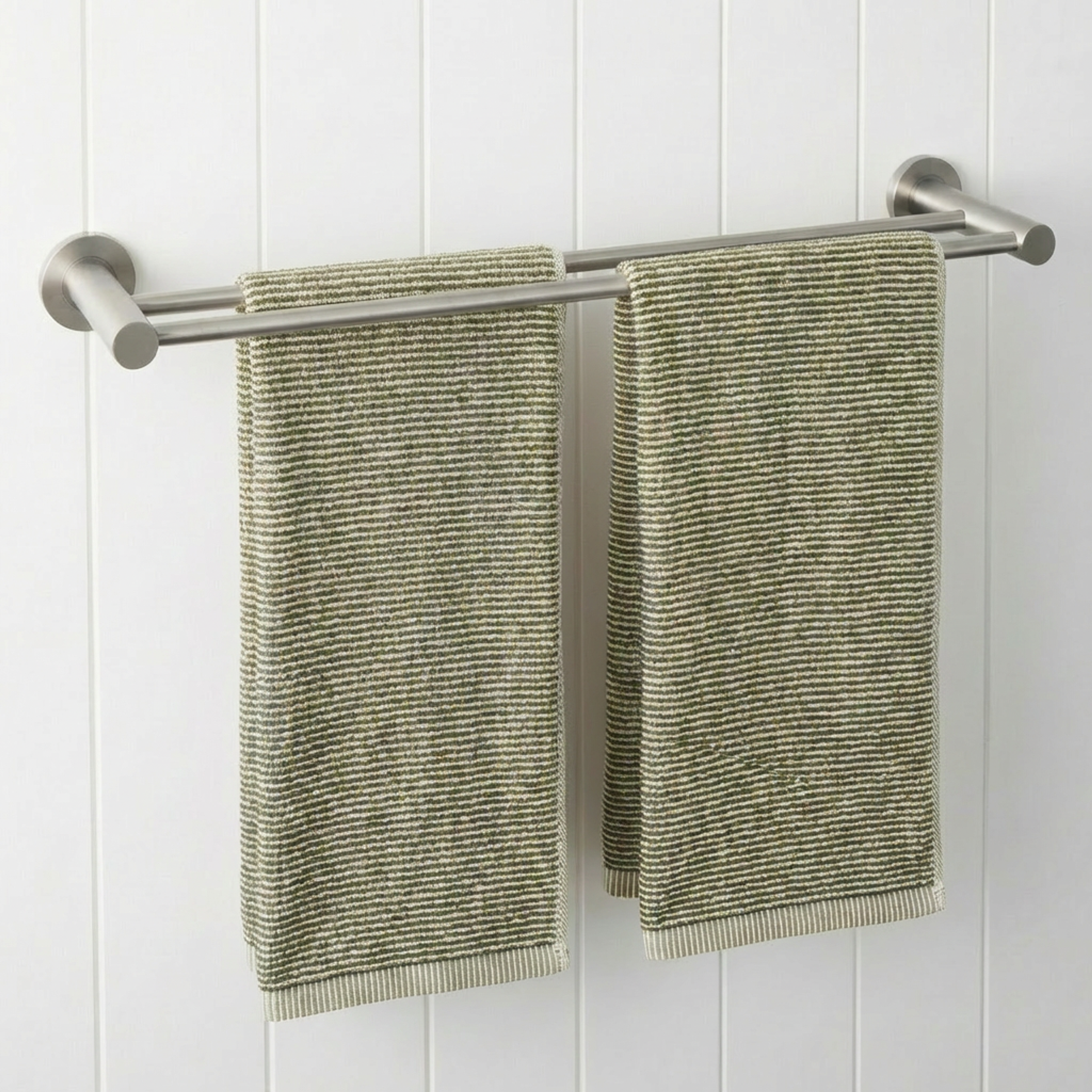 The Sydney Double Towel Rail in Stainless Steel (600mm) brings a clean, linear detail to modern bathrooms. Two slim bars extend from rounded wall plates, allowing towels to hang neatly with space to dry. A simple way to complement stainless steel tapware while keeping your bathroom organised and uncluttered.