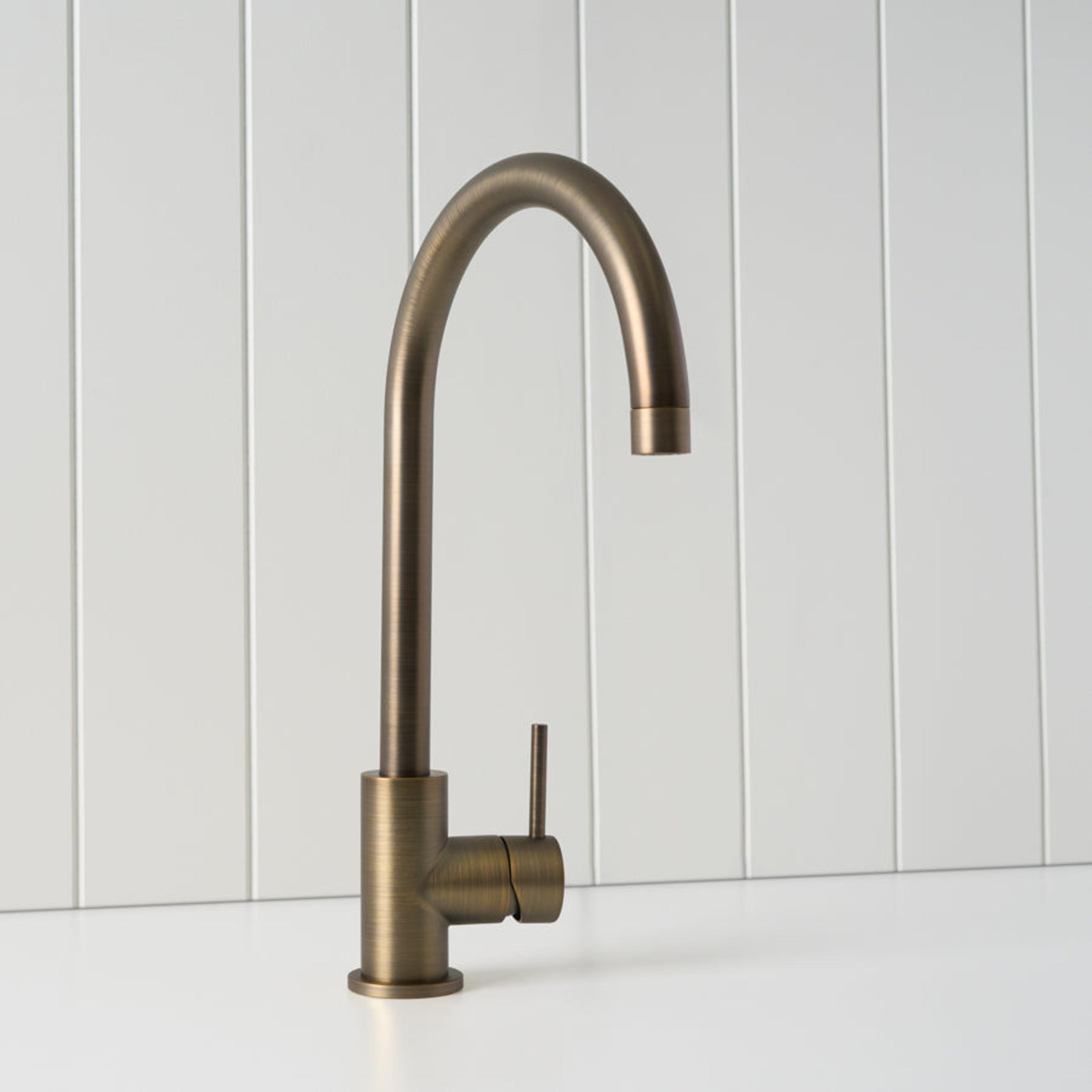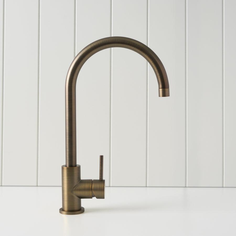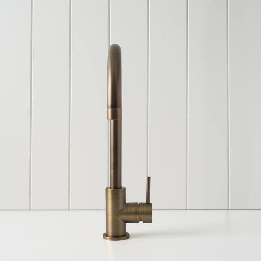 The Sydney Round Kitchen Mixer in Antique Brass is a practical kitchen tap with a warmer look. The stainless steel body and sturdy Antique Brass finish handle daily use, while the high curved spout makes it simple to fill deep pots and clean trays. It is a reliable round sink mixer for busy family kitchens.