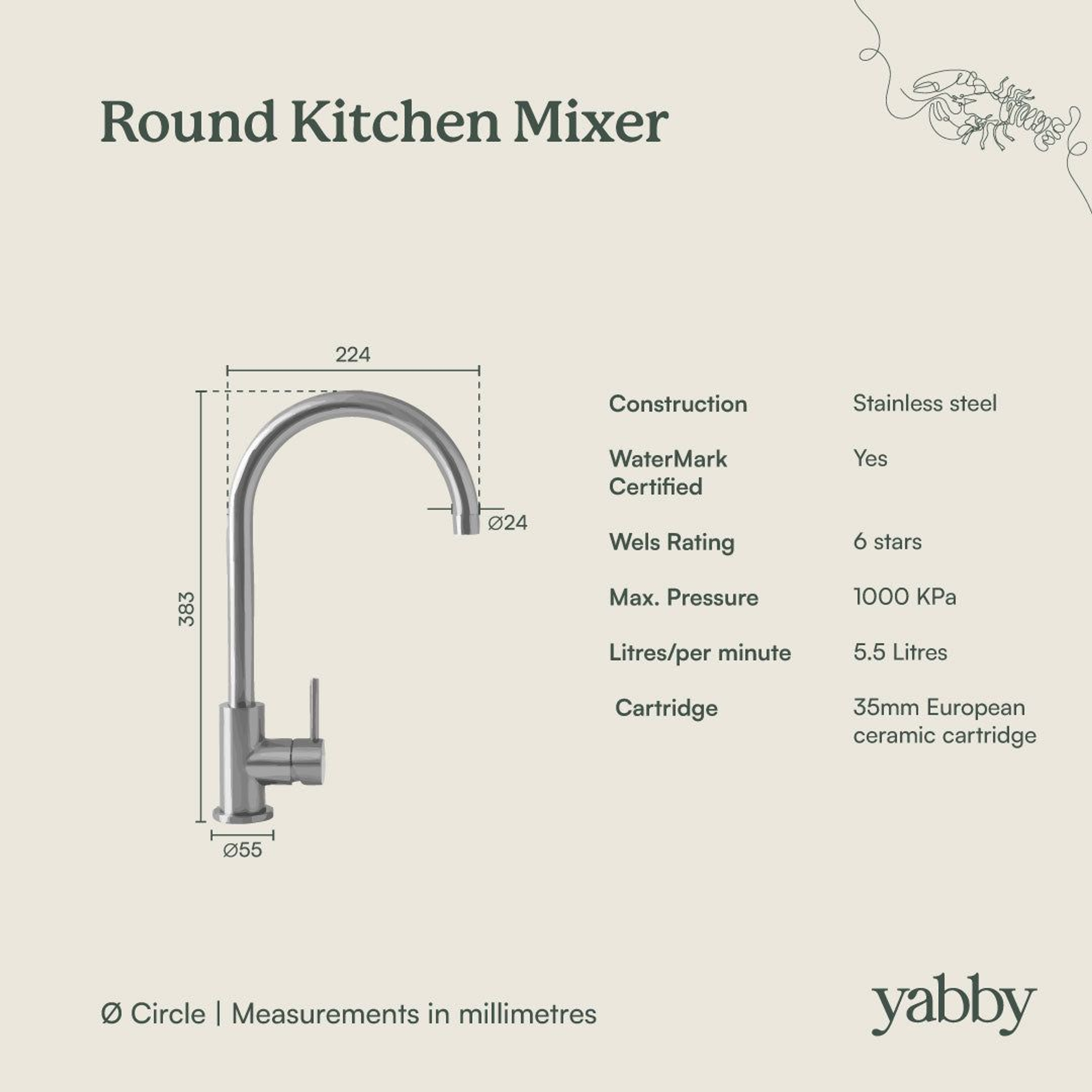 The Sydney Round Kitchen Mixer in Stainless Steel is a reliable choice for anyone wanting a straightforward round kitchen tap. Stainless steel construction is easy to clean and stands up to daily use, and the high swivel spout improves access in single or double bowls. It is a strong all rounder for family kitchens.