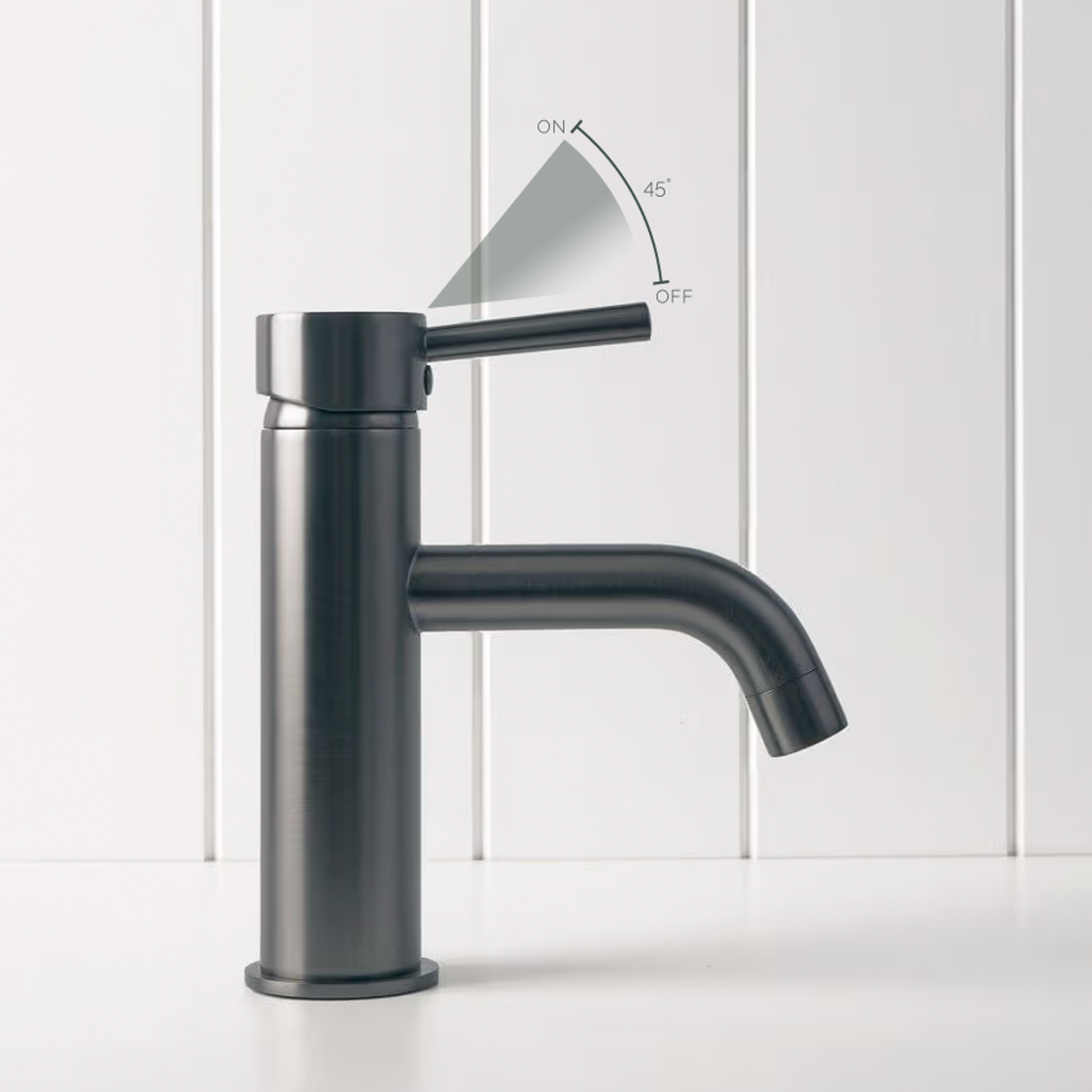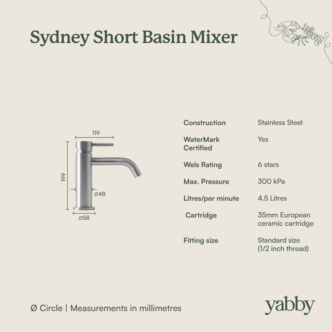 The Sydney Short Basin Mixer in Gunmetal suits renovators who want a darker tap without overwhelming a small bathroom. The stainless steel body is robust, and the short spout helps control water flow in compact basins. It is a practical way to introduce Gunmetal bathroom tapware into powder rooms and ensuites.