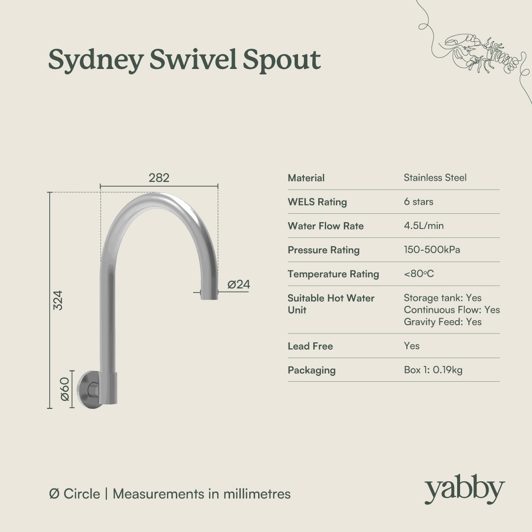The Sydney Swivel Spout Stainless Steel combines a soft gooseneck profile with practical flexibility, offering a refined solution for compact spaces.