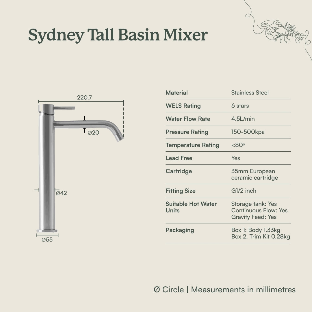 The Sydney Tall Basin Mixer in Antique Brass is a practical tall basin mixer for vessel basins that need extra reach. Stainless steel construction and a durable Antique Brass finish handle daily family use. The single lever makes temperature control simple, keeping the bathroom tap easy to live with.