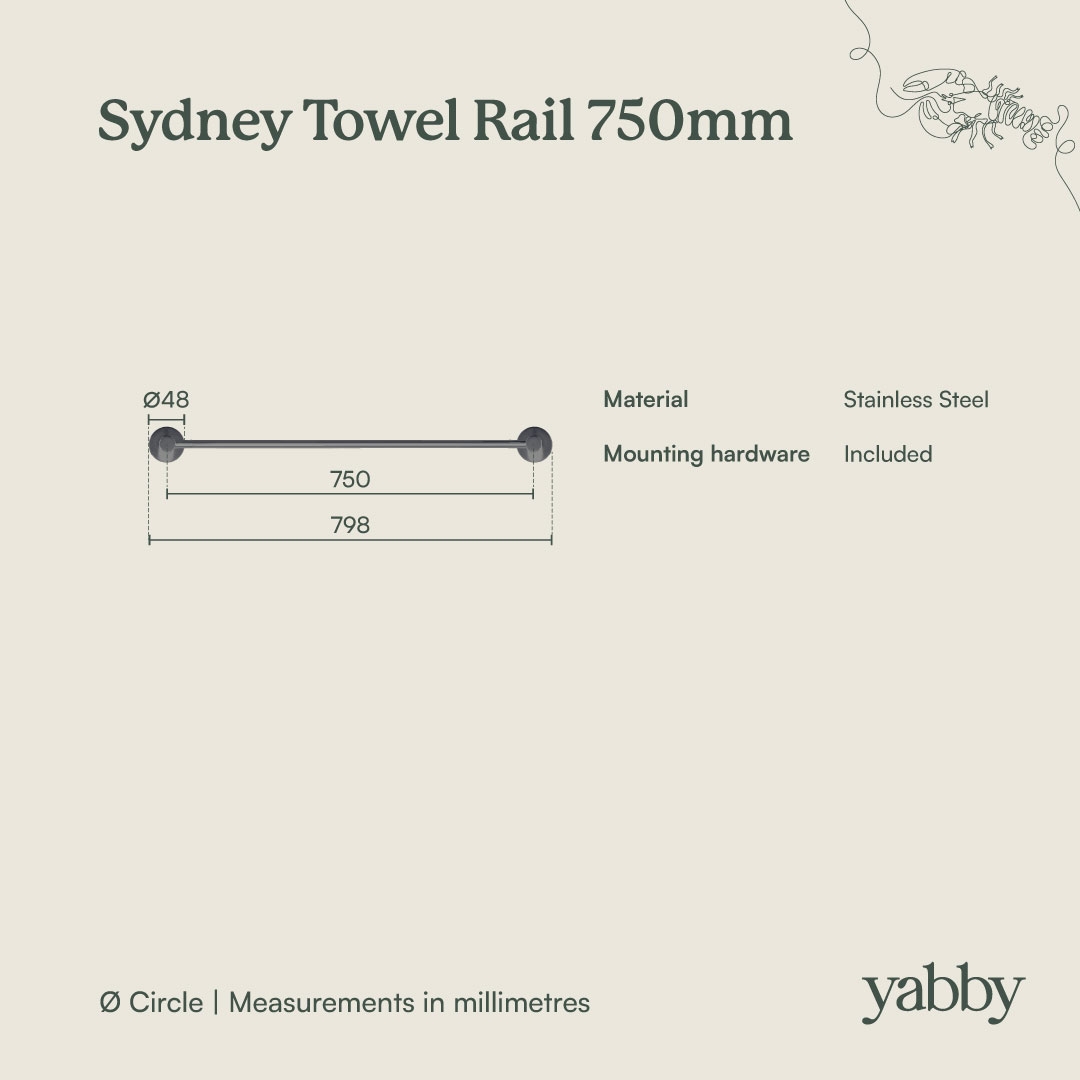 The Sydney Single Towel Rail 750mm is a clean and simple addition to any bathroom. Its generous length provides plenty of space for a full-sized towel to hang comfortably and dry properly after use.