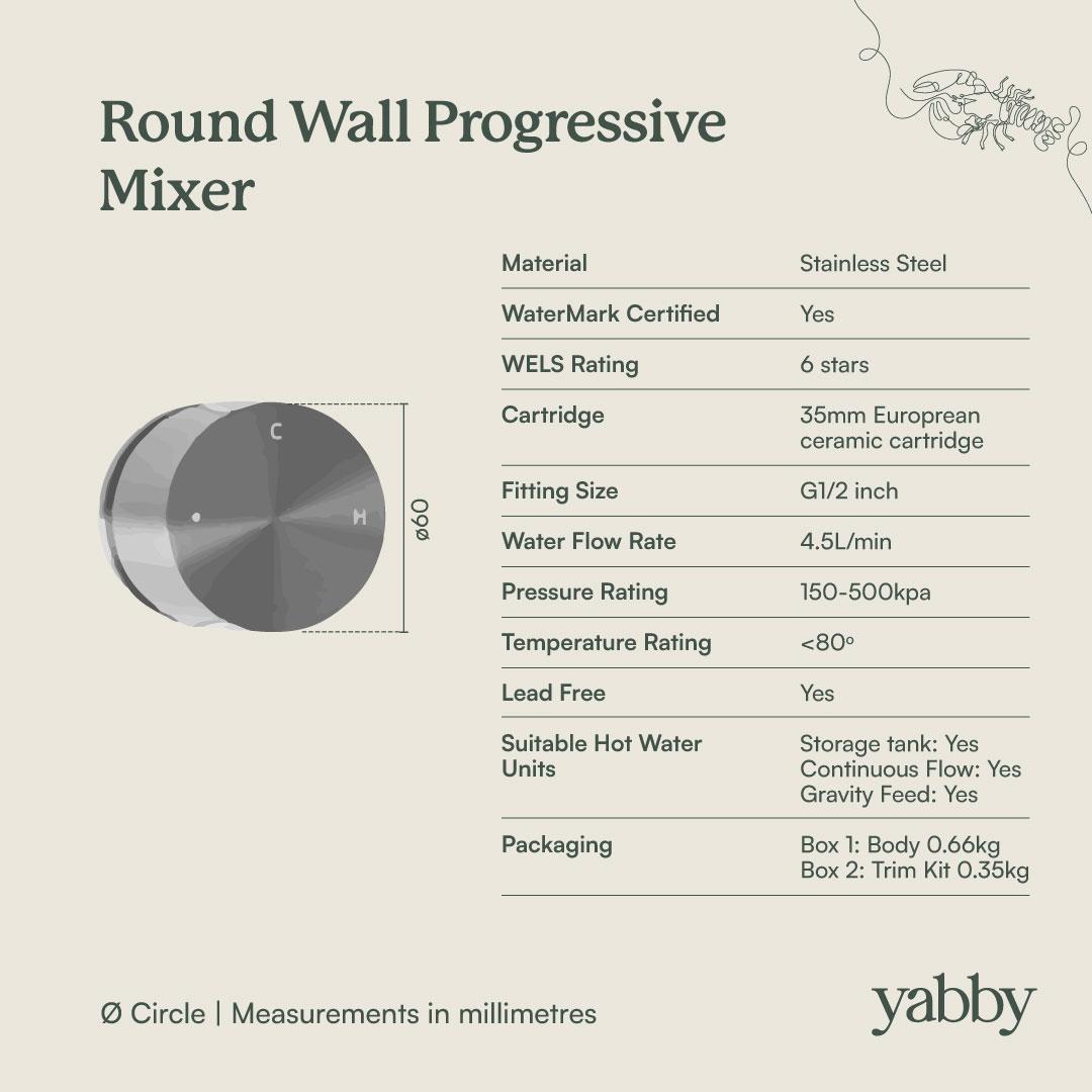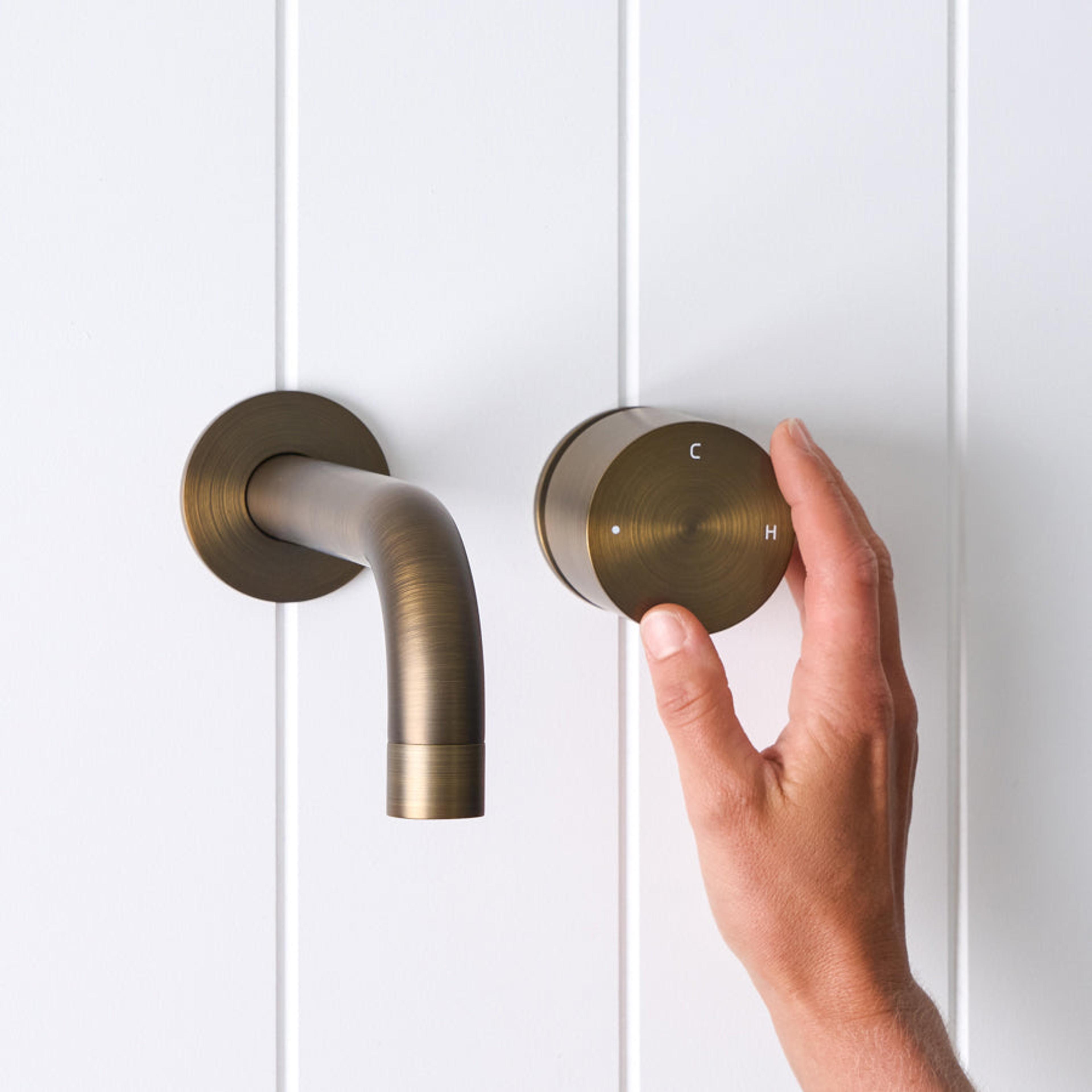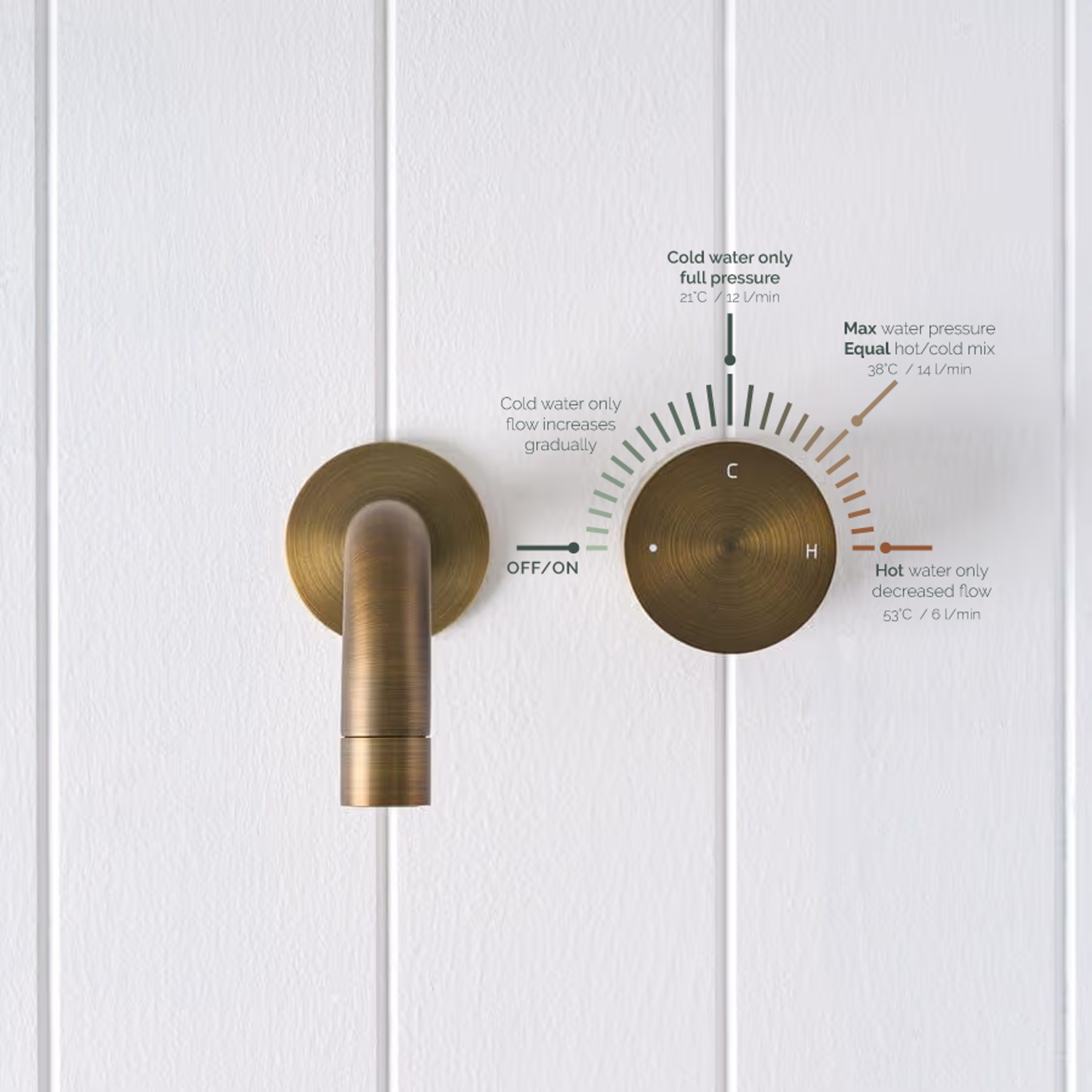 The Sydney Wall Spout and Progressive Mixer in Antique Brass is ideal if you want simple, accurate temperature control. Turn the progressive mixer to start a cold flow, then keep turning for more pressure and warmer water, all from one handle. The sturdy stainless steel body and Antique Brass finish make this wall spout and mixer easy to live with.