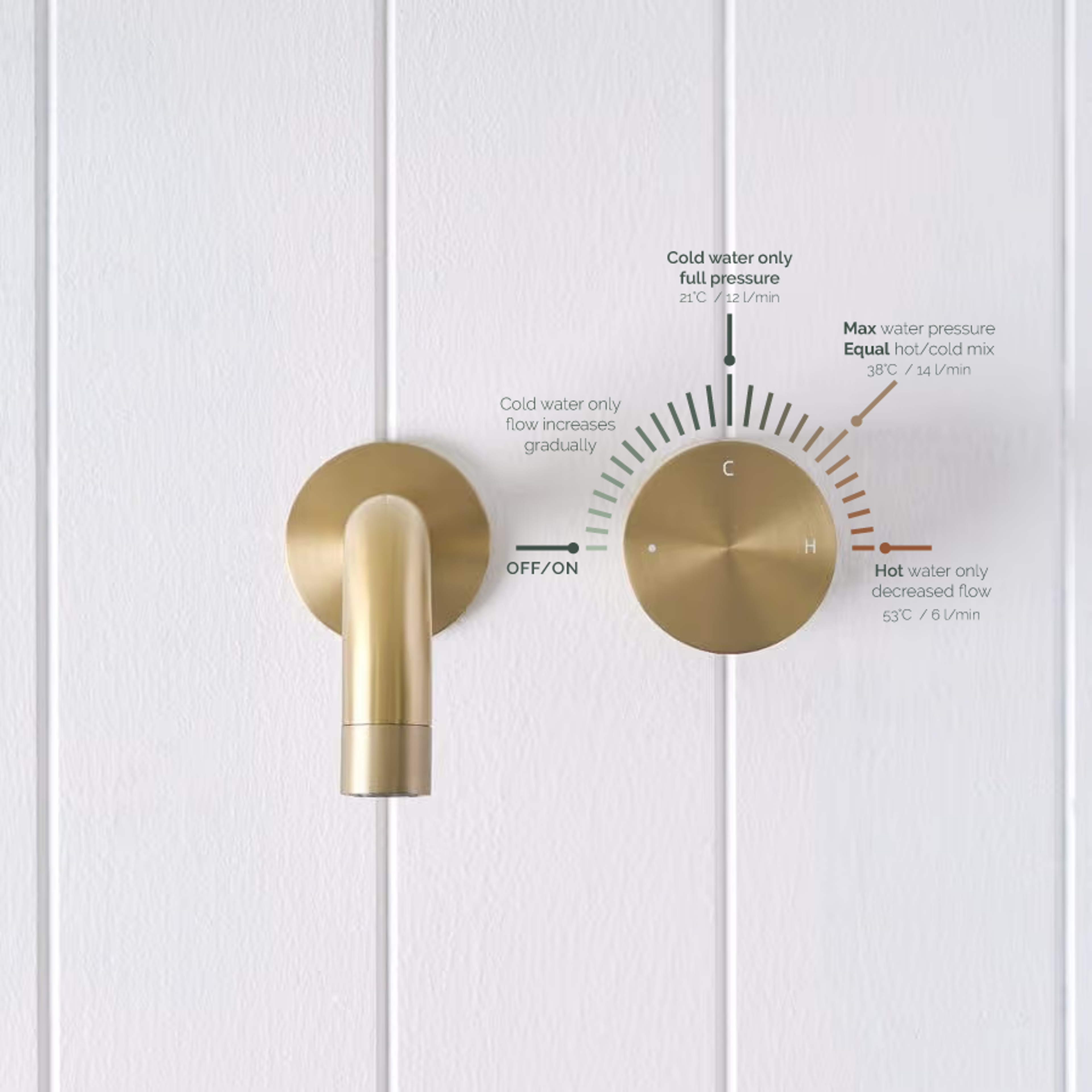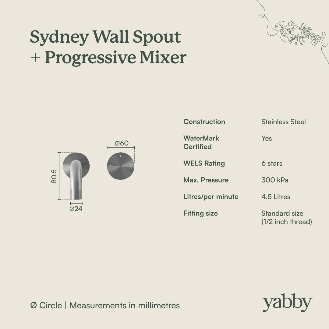 The Sydney Wall Spout and Progressive Mixer in Warm Brushed Nickel is perfect if you want gentle colour with simple control. The warm brushed surface is forgiving on marks, and the progressive mixer makes it easy to find a comfortable shower temperature with one hand. This wall spout and mixer keeps everyday use straightforward.