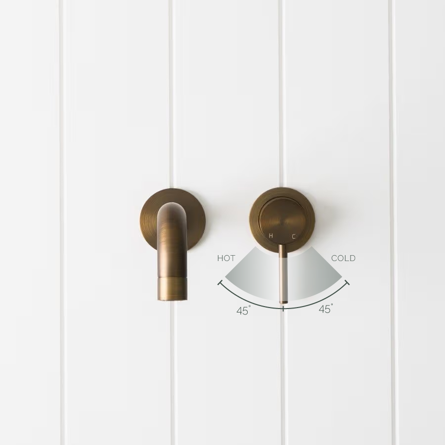 The Sydney Wall Spout and Wall Mixer in Antique Brass is a practical way to add warmth and clear water control. The wall spout delivers a steady stream while the single mixer sets temperature with one hand. With fewer fittings on the vanity, cleaning around the basin is easier.