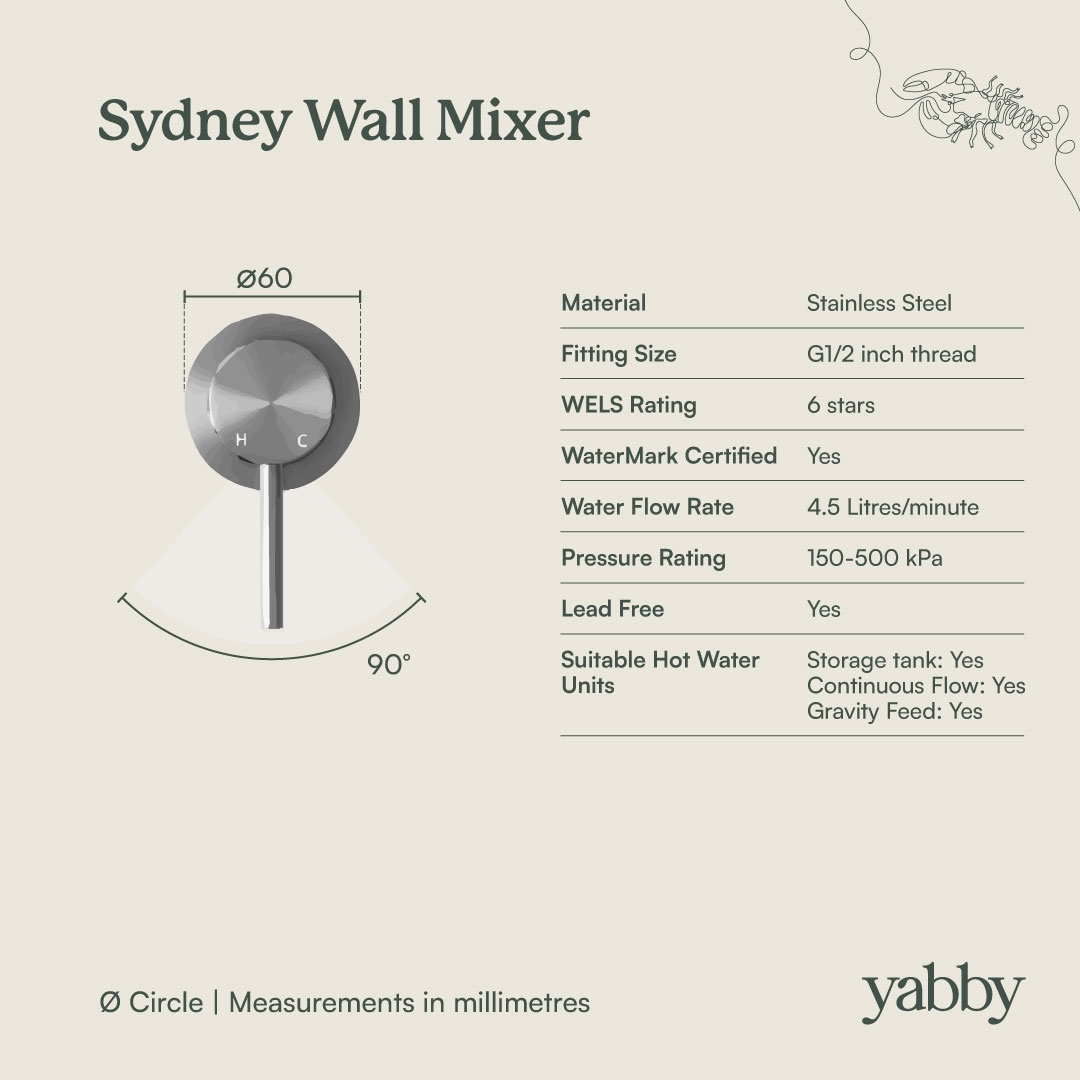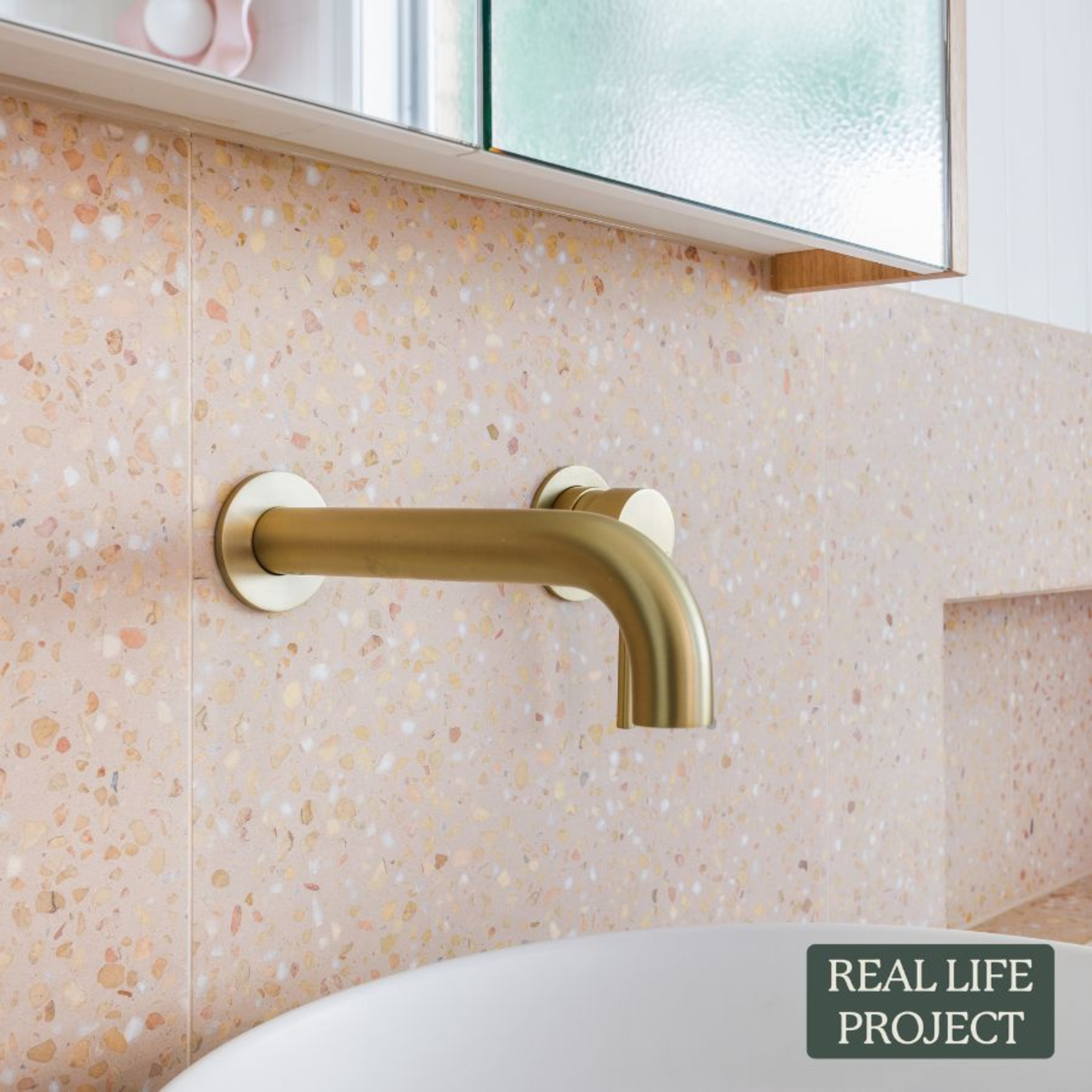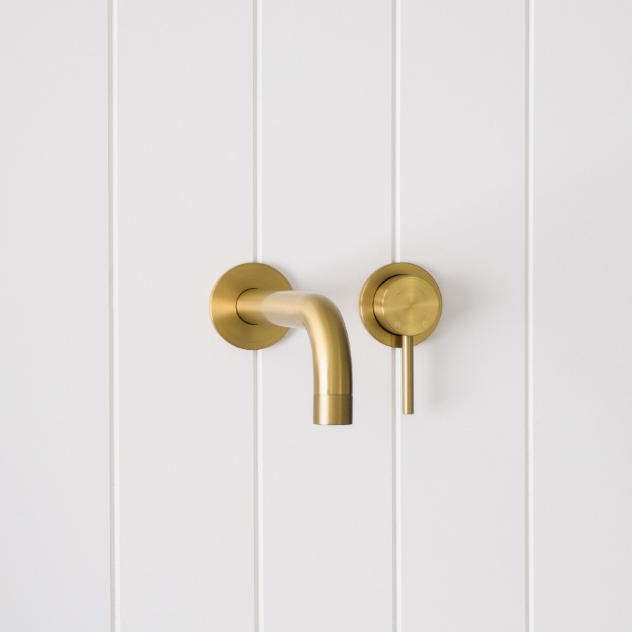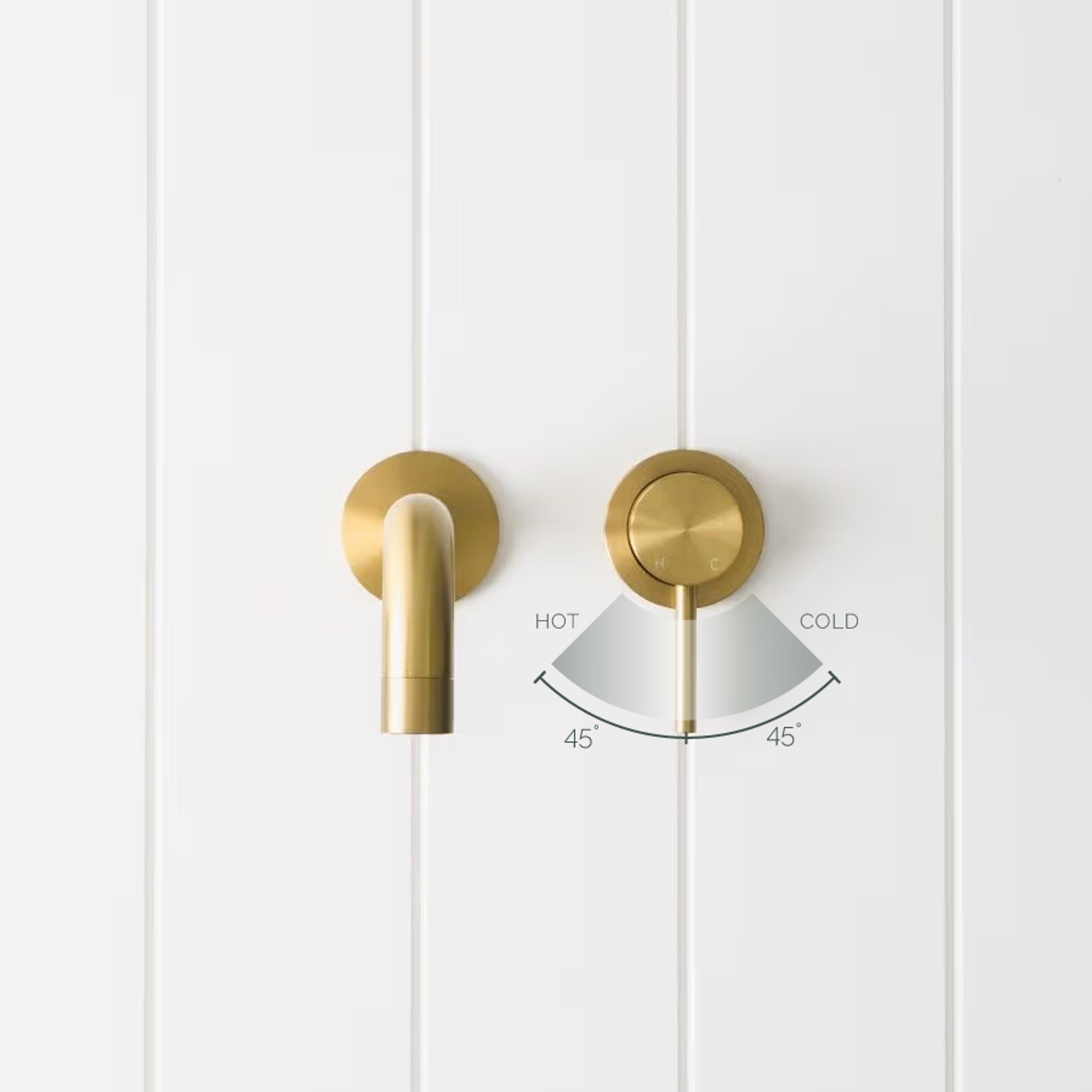 The Sydney Wall Spout and Wall Mixer in Brushed Brass suits busy bathrooms that still want a soft metal finish. The brushed surface helps hide fingerprints, and the single mixer makes it easy to find a comfortable temperature. Wall mounting keeps the basin edge clear for soap and everyday essentials.