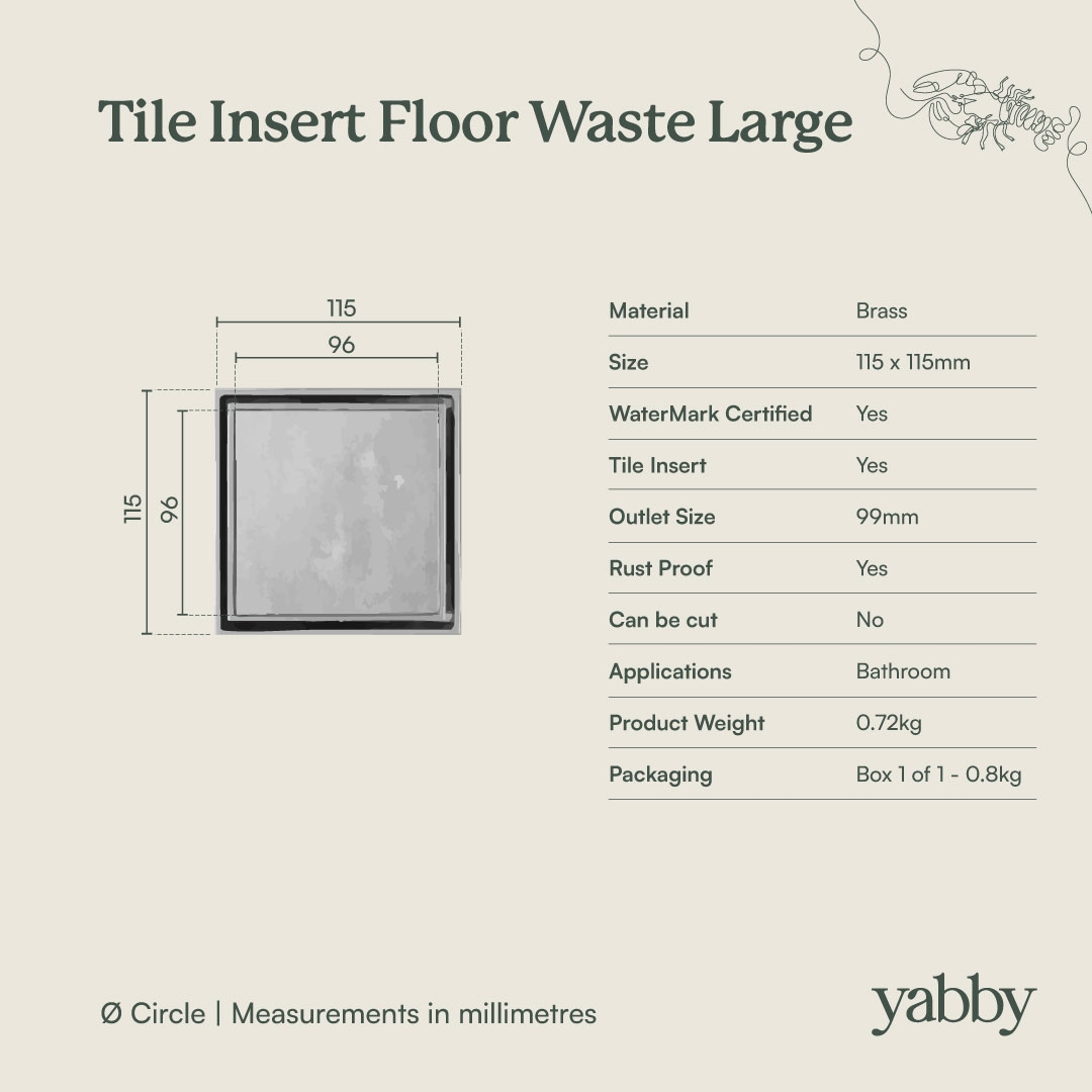 This Yabby tapware tile insert floor waste has been designed to sit in the tile giving it the perfect flushed appearance blending perfectly into your floor tiles. This floor waste system has a high-grade brass construction, making it strong and durable to last a lifetime.
