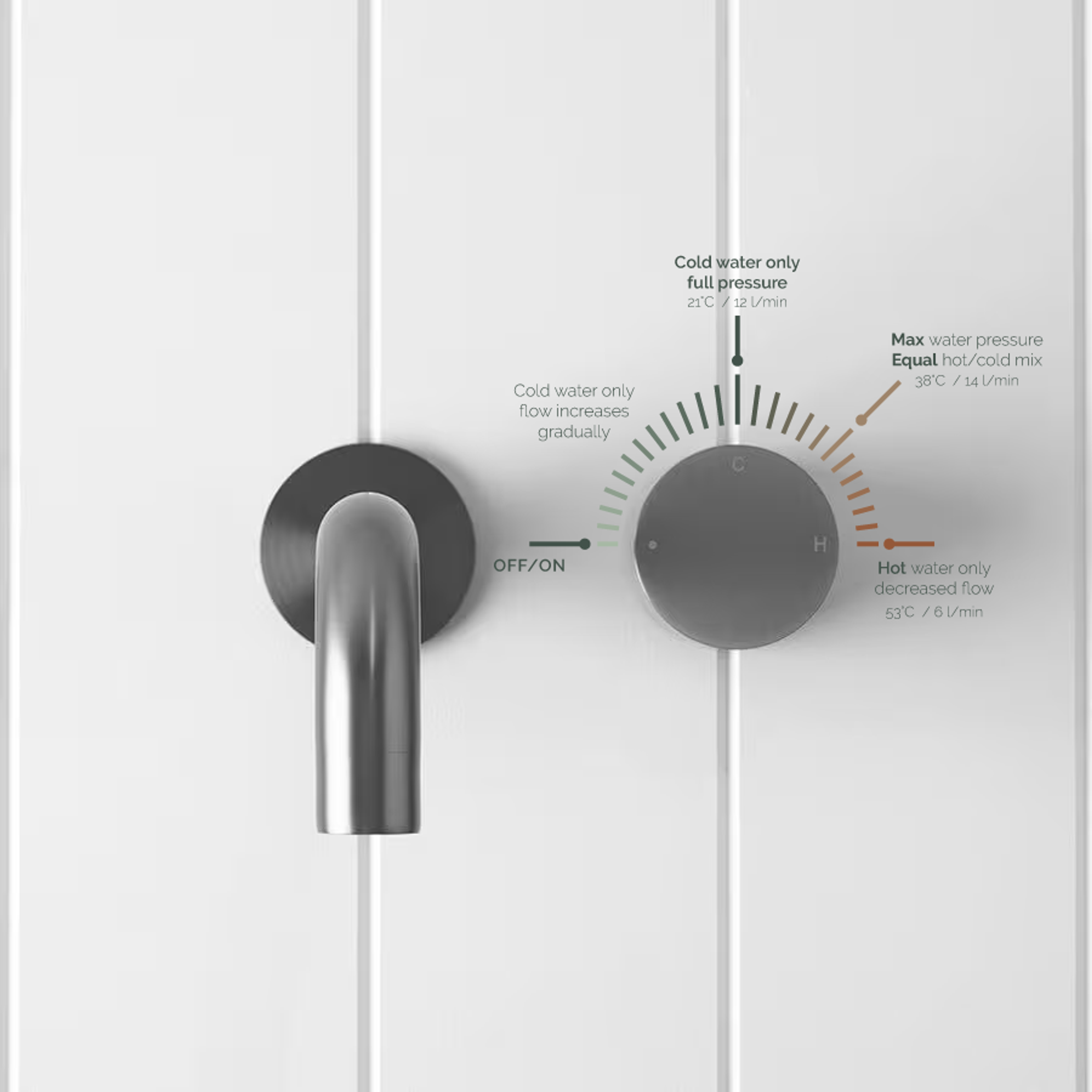The Sydney Wall Spout and Progressive Mixer in Gunmetal is ideal if you like darker tapware with everyday practicality. The progressive mixer gives clear stages from cool to hot, helping avoid sudden changes in the shower. Durable stainless steel construction and the Gunmetal finish make this wall spout and mixer a solid choice for family spaces.