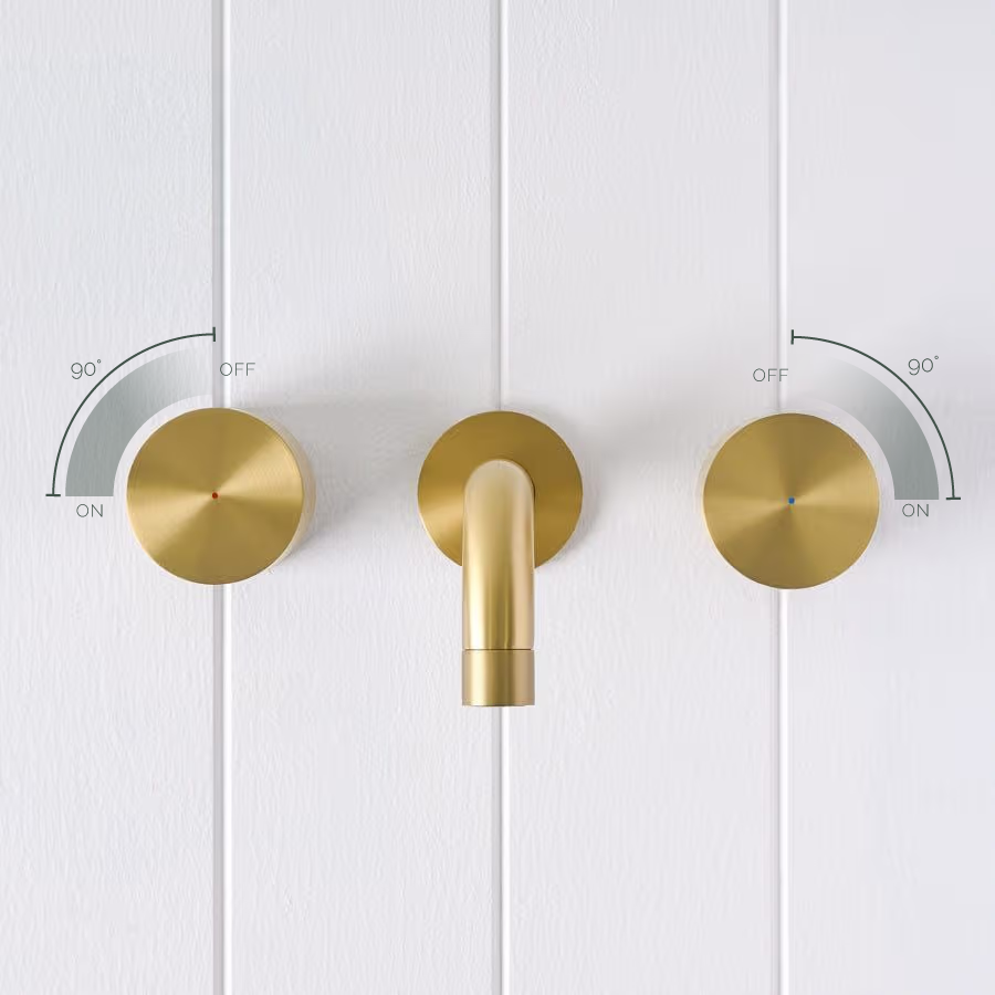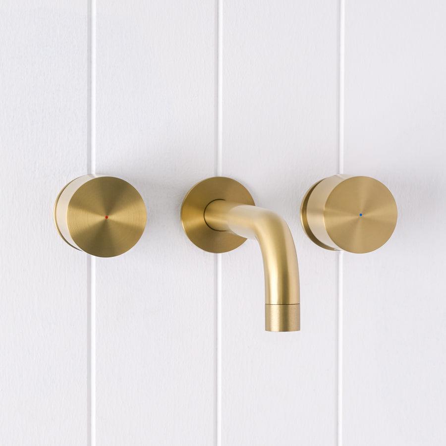 The Sydney Wall Spout and Round Wall Taps in Brushed Brass suits busy households that still want a bit of warmth. The brushed surface helps disguise fingerprints and water spots, and the separate taps let you fine tune temperature easily. Wall mounting also keeps benchtops clearer around the basin or bath.