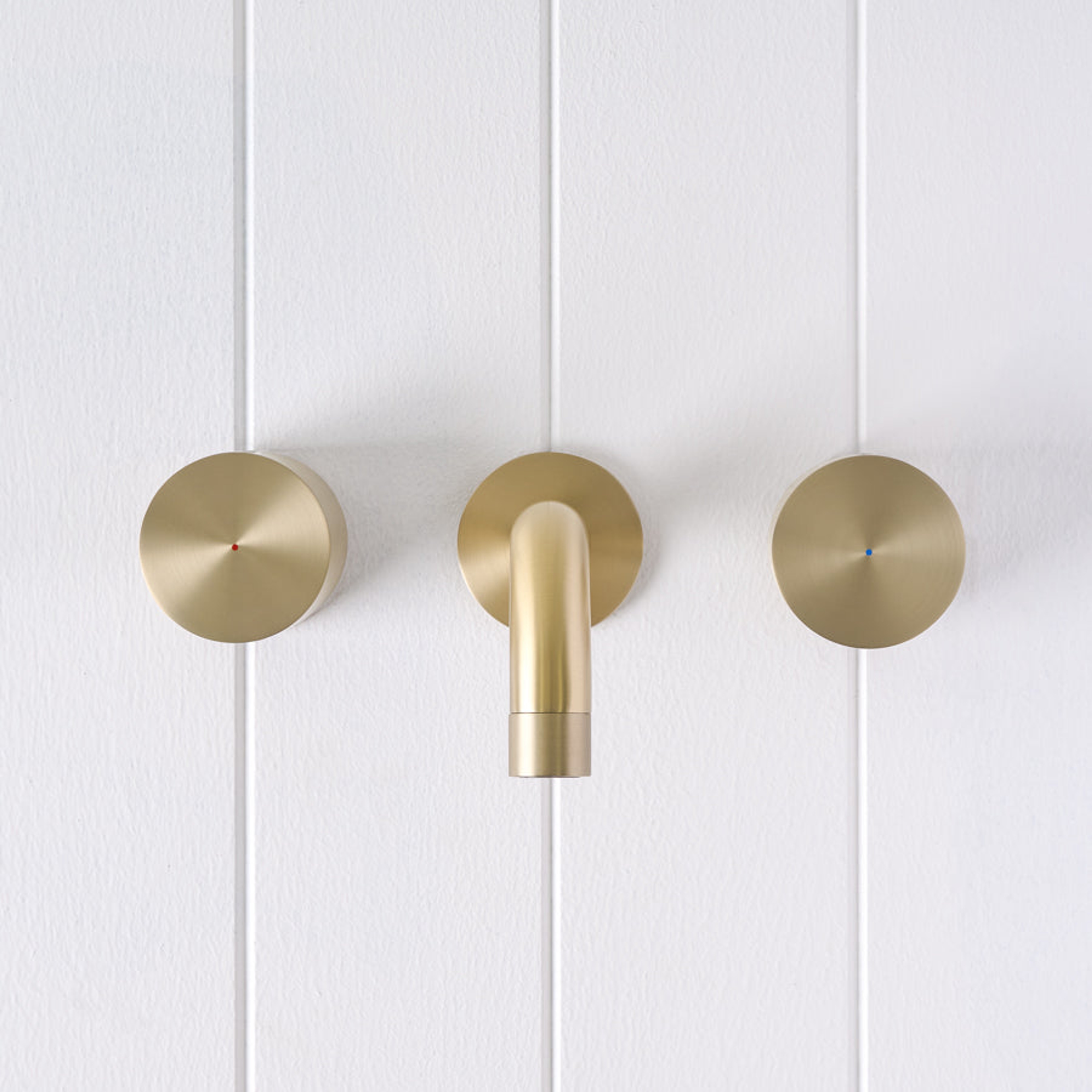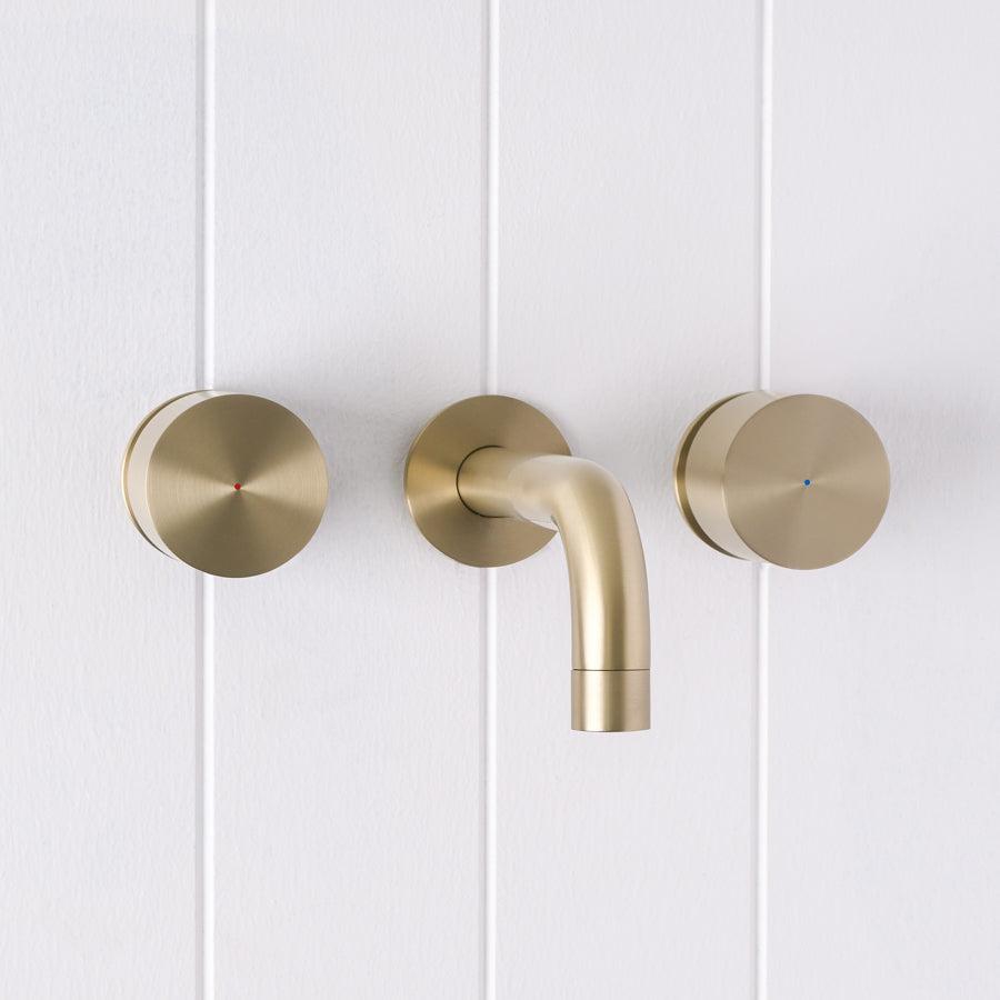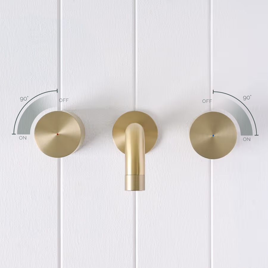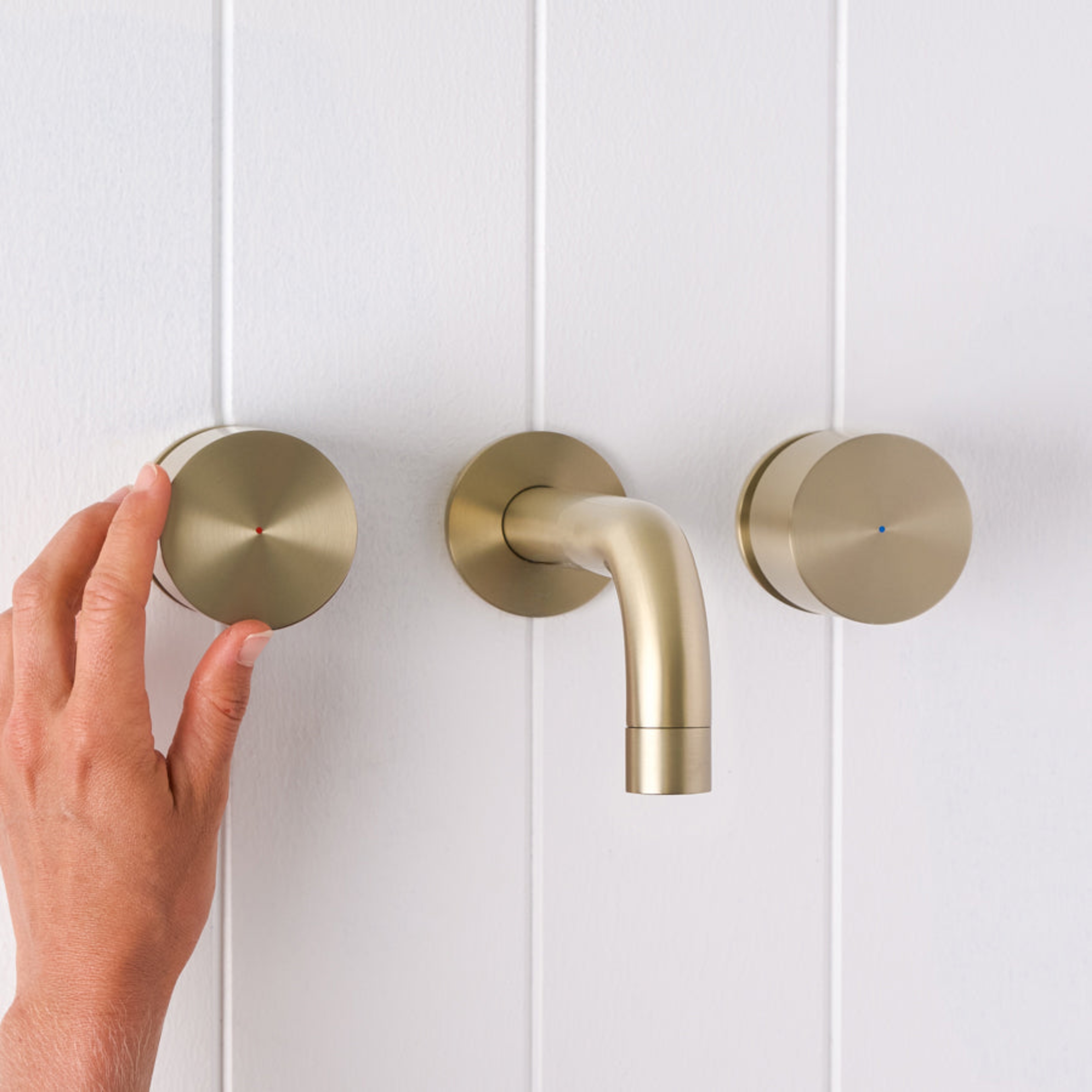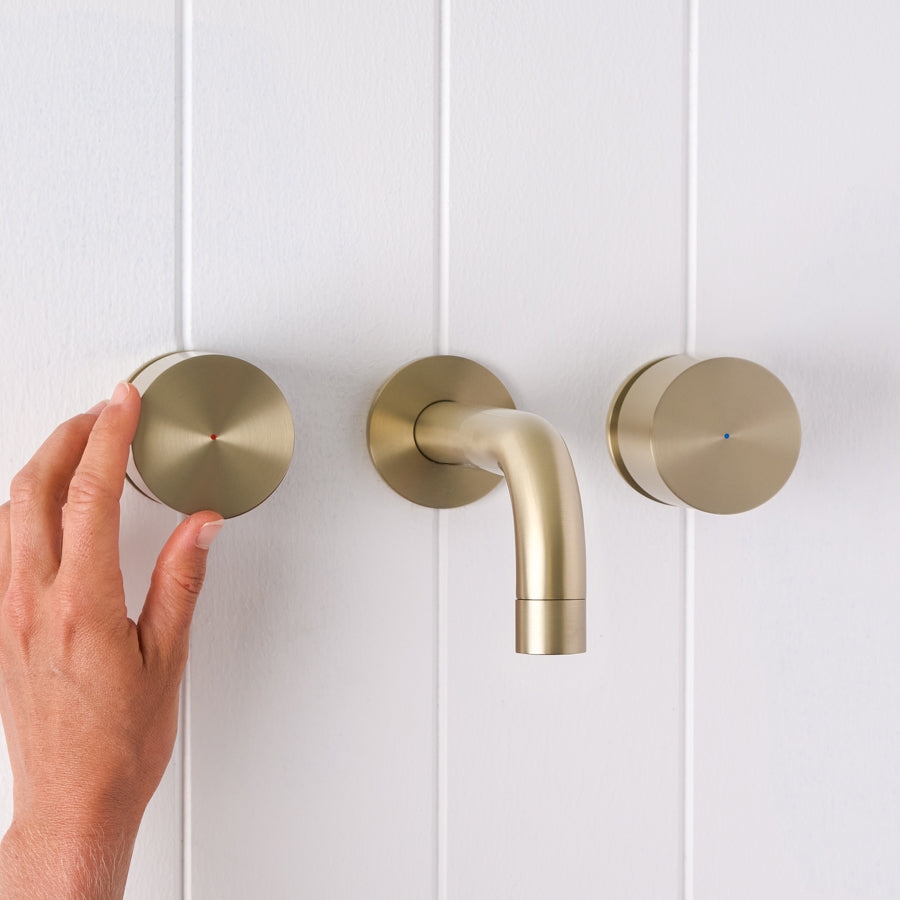 The Sydney Wall Spout and Round Wall Taps in Warm Brushed Nickel is perfect if you want a gentle metal tone that hides marks well. The warm brushed surface is forgiving, and the dual taps give clear hot and cold control. Wall installation keeps the basin edge less crowded and easier to clean.